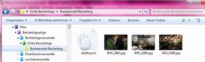 Hallo, bei mir landen alle Fotos (RAW-Dateien) zuerst in einer chronologischen Ordnerstruktur (Jahr/Monat). Von da aus werden dann die JPG's exportiert. Arten, die ich nicht bestimmen kann, landen bei den "X-Pilzen", bestimmbare Arten werden in einer Verzeichnisstruktur beginnend mit der Ordnung abwärts einsortiert. Mit z.B. Folder Marker lassen sich die Verzeichnisse zur besseren Übersicht einfärben. Das sieht dann im Explorer so aus: