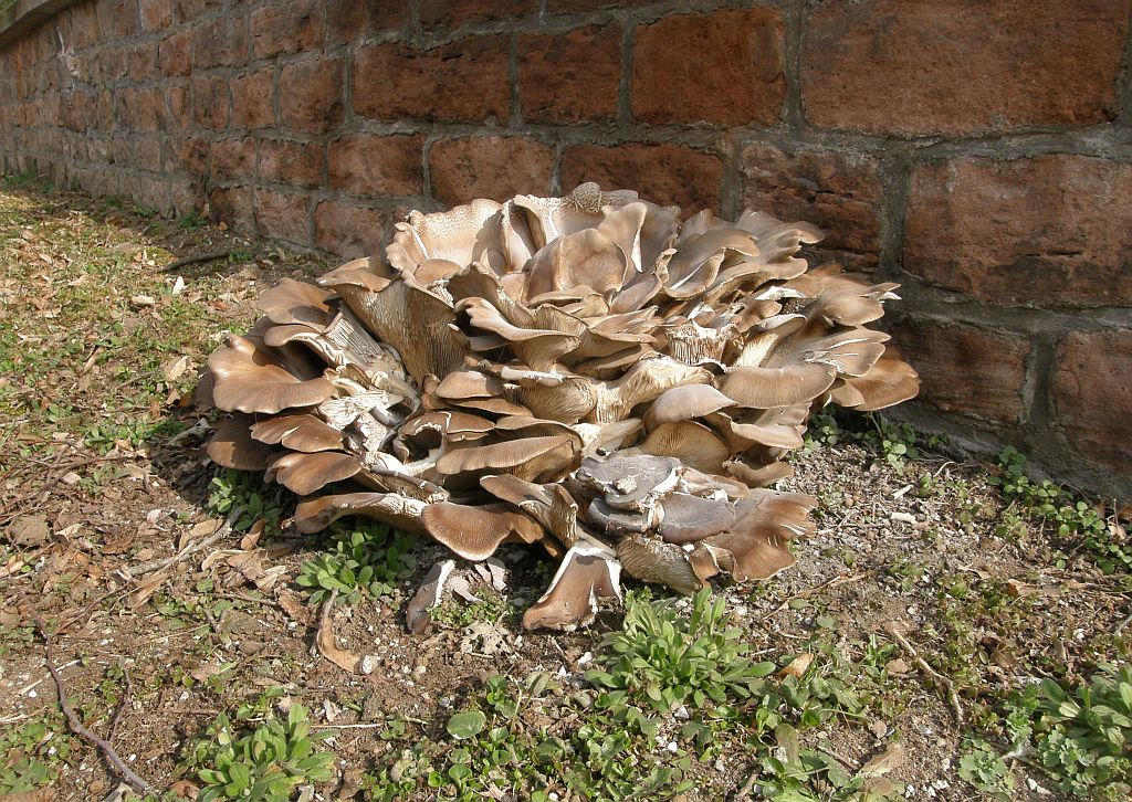 Der Erdmuscheling (Hohenbuehelia petalodes) wächst scheinbar auf dem Erdboden an vergrabenem Holz (was P. ostreatus sehr selten tut), wird dabei ziemlich groß und hat einen geschlitzten Hut.