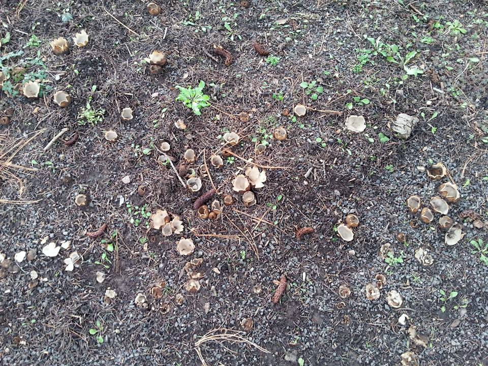 Plötzlich sah ich in der Nähe von einem Zeder-Baum die kugelrunden aufgeplatzten Pilze wachsend, die meist in den Grüppchen aber manchmal auch vereinzelt wuchsen und mehr oder weniger aus dem Boden heraus ragten.
