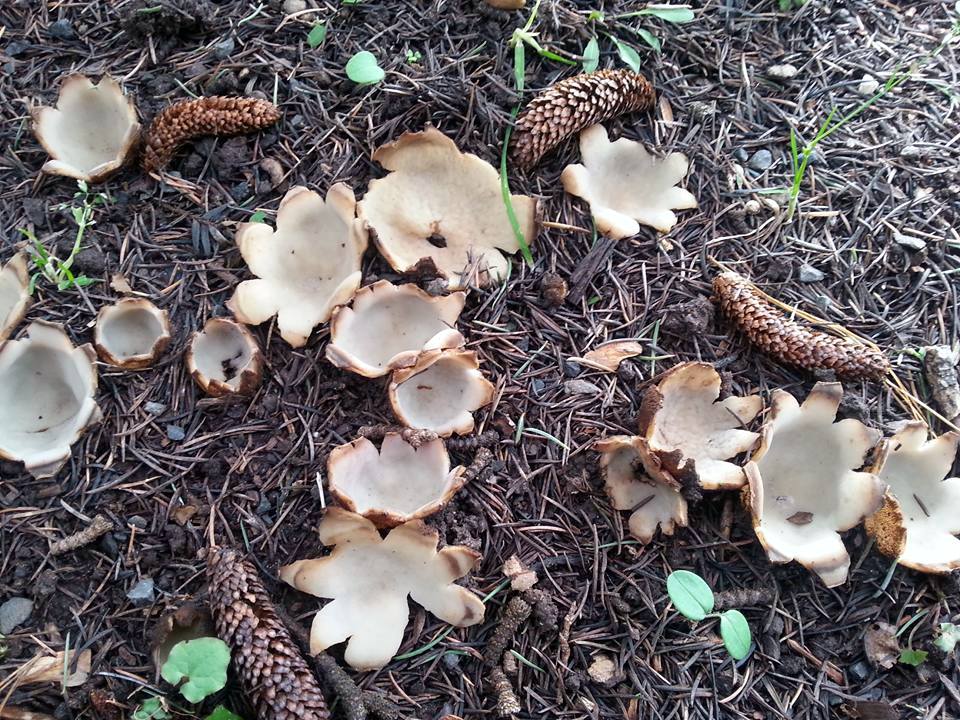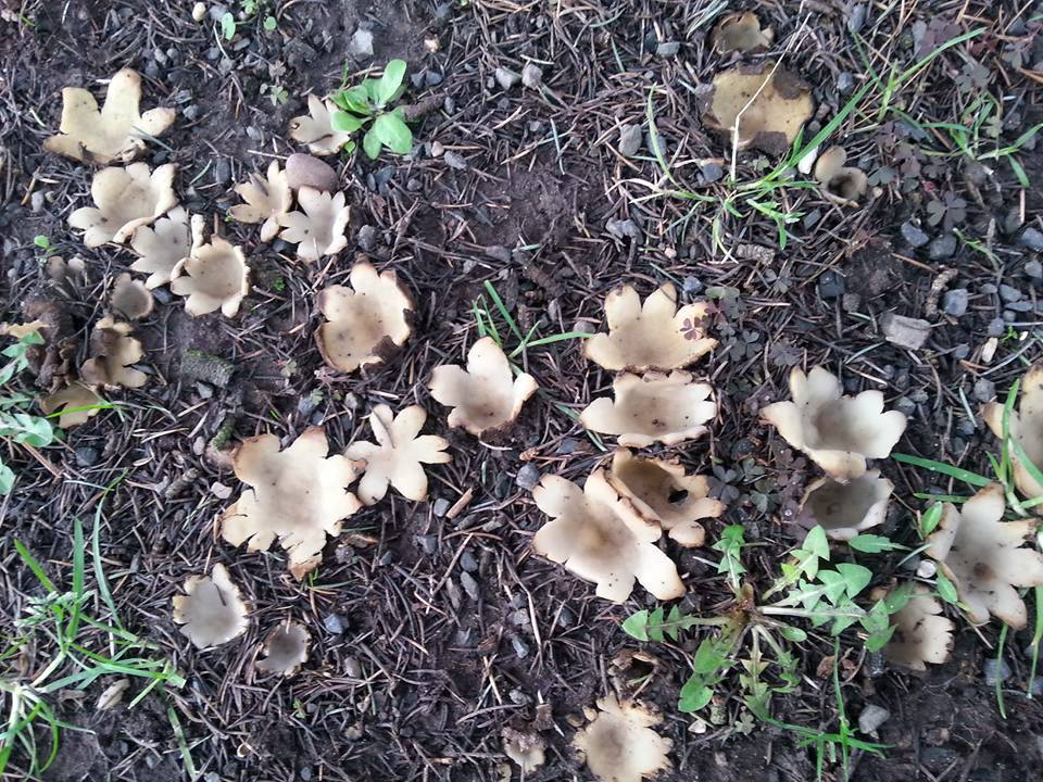Plötzlich sah ich in der Nähe von einem Zeder-Baum die kugelrunden aufgeplatzten Pilze wachsend, die meist in den Grüppchen aber manchmal auch vereinzelt wuchsen und mehr oder weniger aus dem Boden heraus ragten.