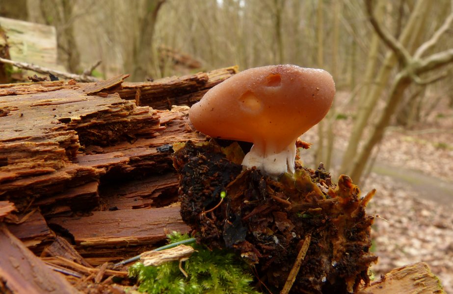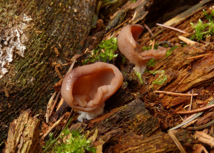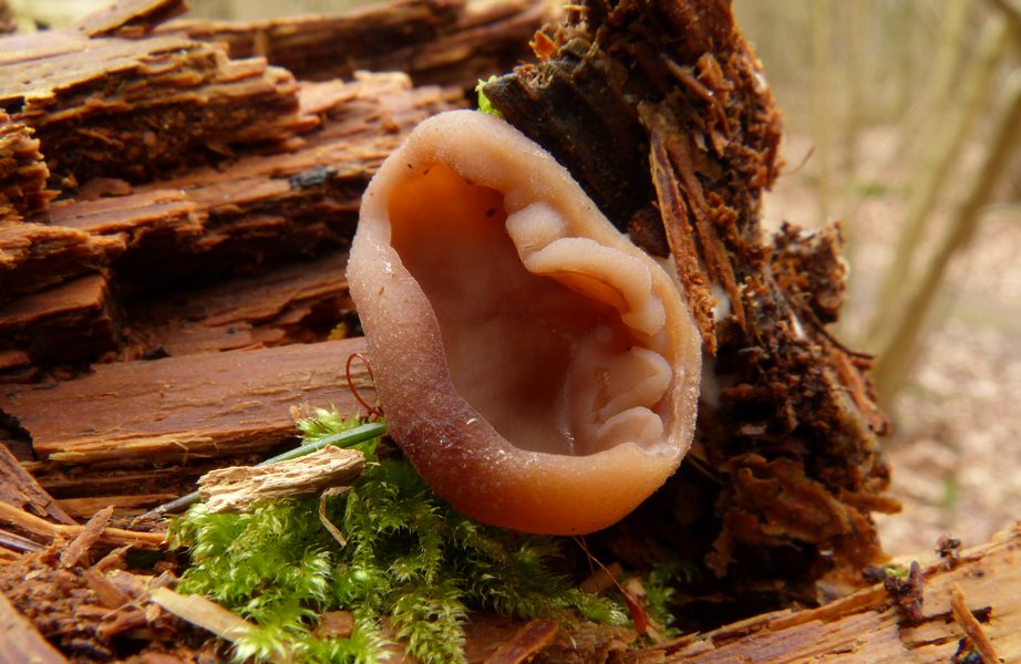 Der Holzstapel (s.Foto) war schon fast verrottet (und für mich nicht "bestimmbar"), das Holz schon weich und krümelig. Drumherum Kiefern, Buchen und ein paar andere, eher trocken. Auf dem Holz nahe der Schnittstelle wuchsen diese Pilze, die ich für Peziza halte, max 25 mm breit.