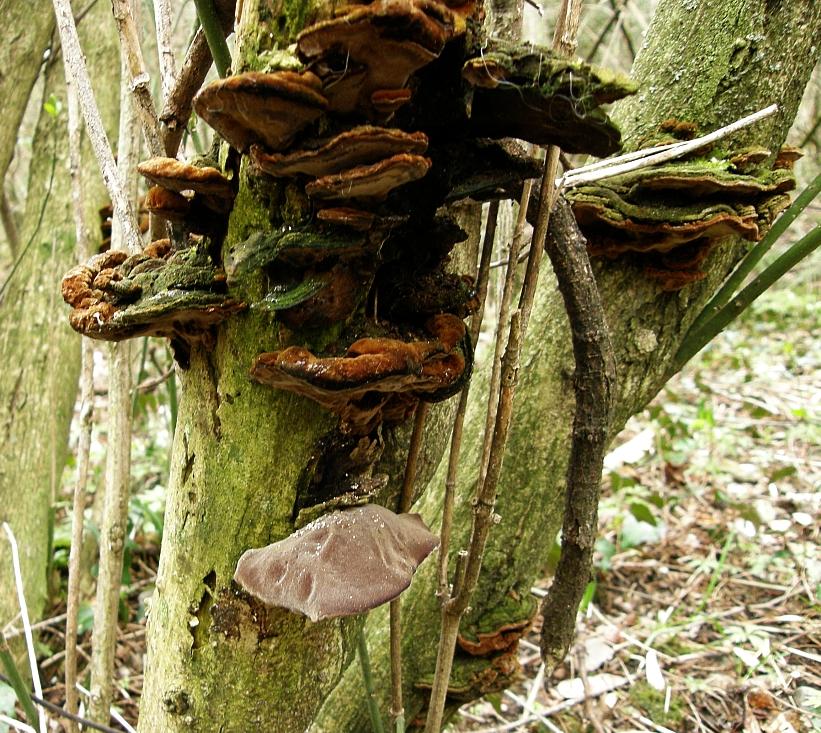 Trametes versicolor ist klar der zweite könnte ein Feuerschwamm sein viell. Phellinus torulosus kannst mal damit vergleichen.