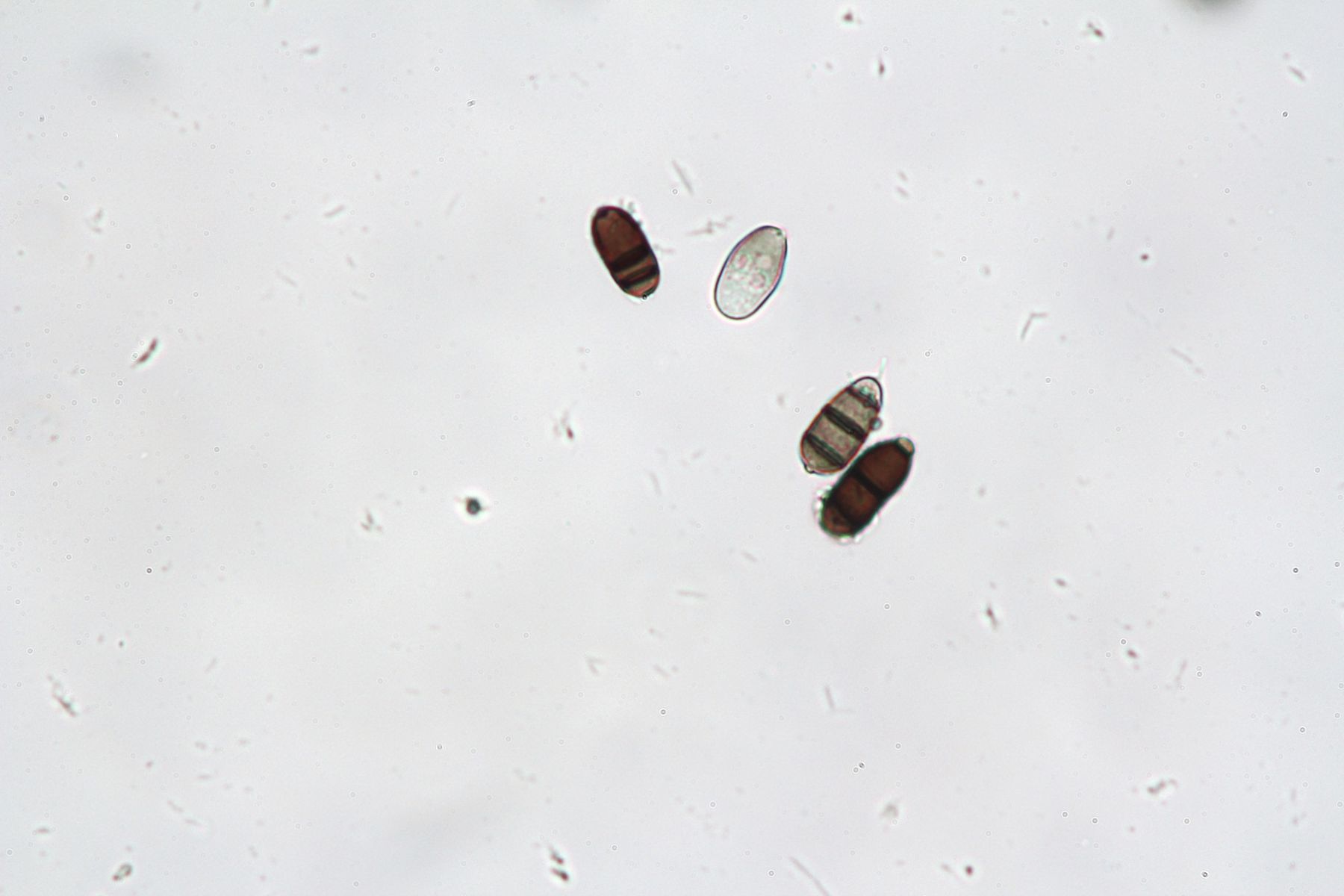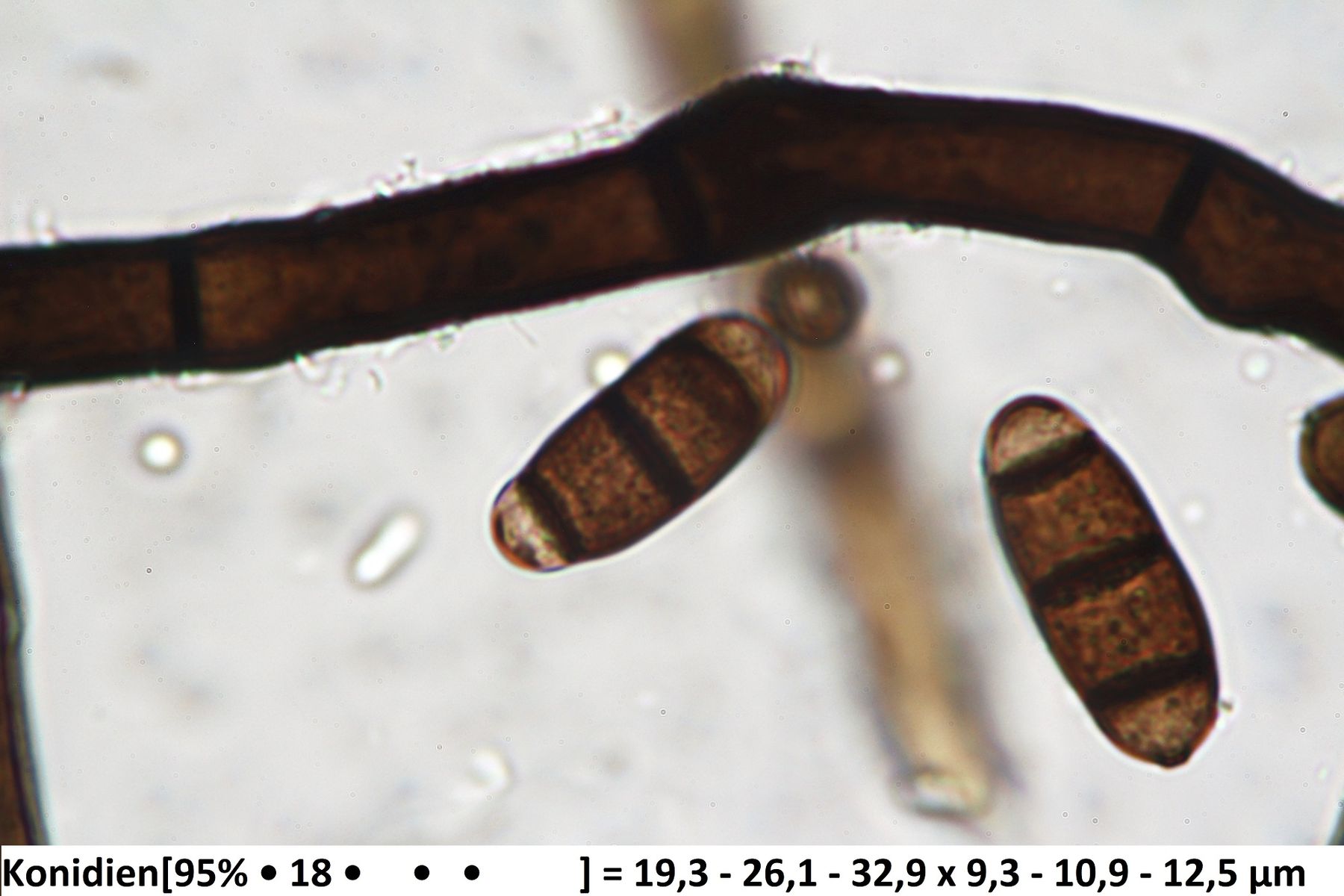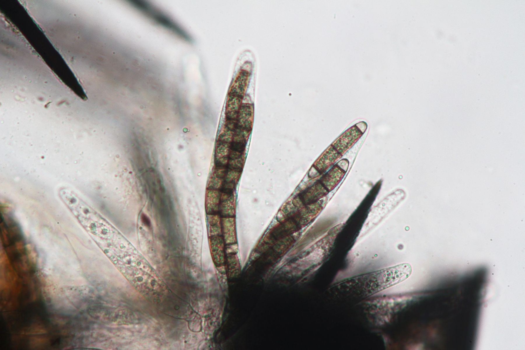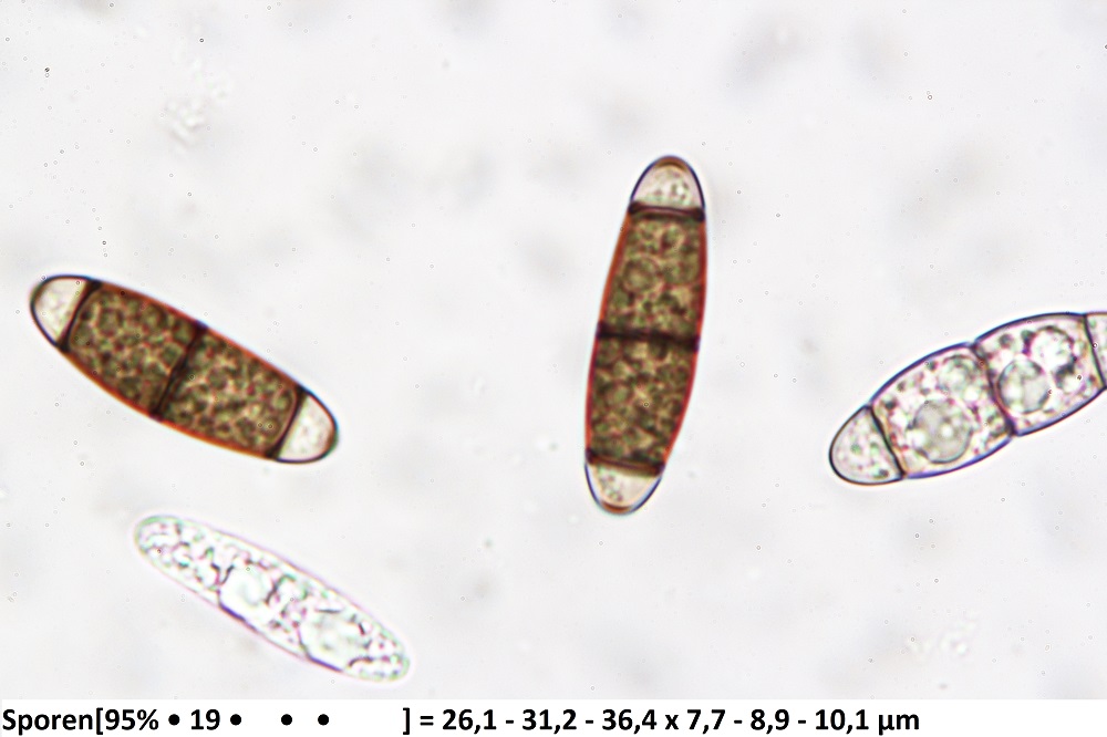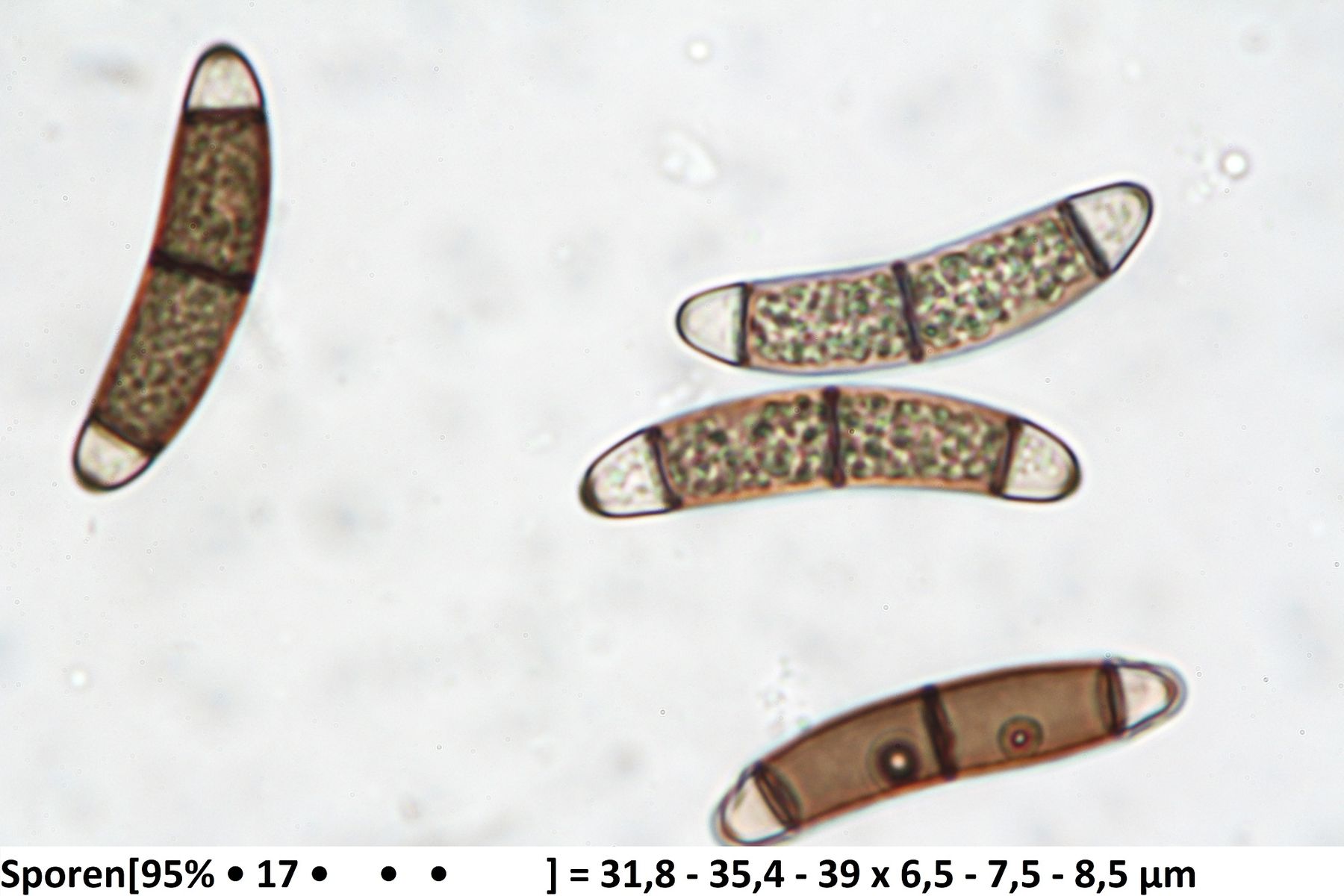 Sporen 29-36x6,5-8 µm, lang elliptisch, häufig gebogen, zunächst hyalin, dann die beiden mittleren Zellen braun färbend, während die beiden Endzellen hyalin bleiben, an den Polen mit auffallend dunklen Verdickungen, glatt, mit vielen kleinen Tröpfchen gefüllt. Asci 120-160x14-20 µm, achtsporig, mit kurzem Stielteil, ohne sichtbaren Apikalapparat, Sporen unregelmäßig biseriat angeordnet. Paraphysen kurzzellig, aus dicken Zellen bestehend, im Alter zerfließend.