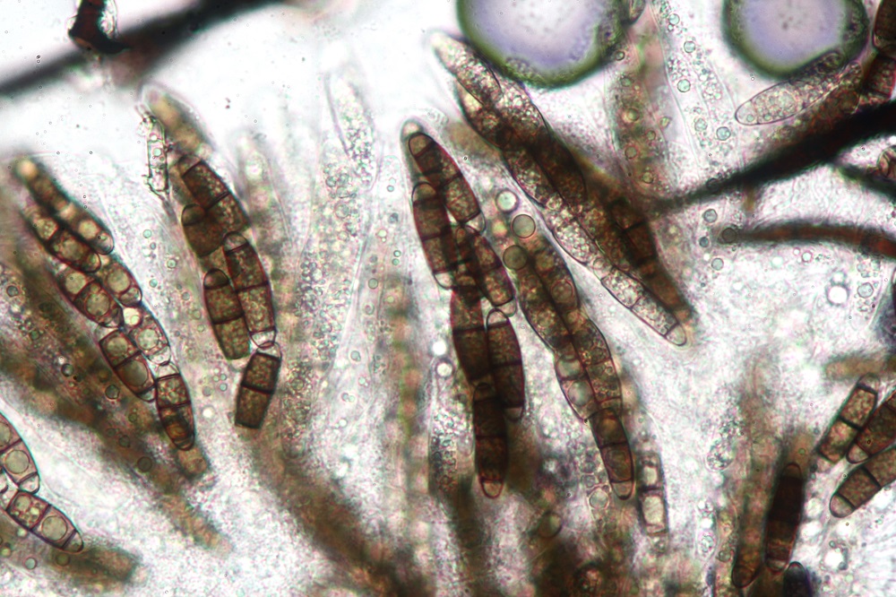 Sporen 29-36x6,5-8 µm, lang elliptisch, häufig gebogen, zunächst hyalin, dann die beiden mittleren Zellen braun färbend, während die beiden Endzellen hyalin bleiben, an den Polen mit auffallend dunklen Verdickungen, glatt, mit vielen kleinen Tröpfchen gefüllt. Asci 120-160x14-20 µm, achtsporig, mit kurzem Stielteil, ohne sichtbaren Apikalapparat, Sporen unregelmäßig biseriat angeordnet. Paraphysen kurzzellig, aus dicken Zellen bestehend, im Alter zerfließend.