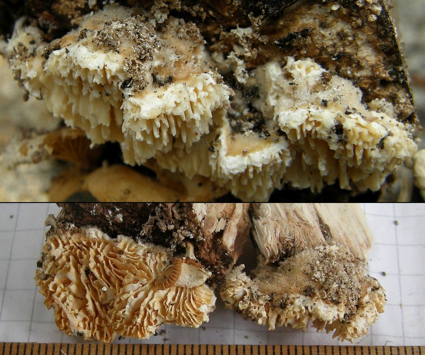 Ein etwas ungewöhnlich ausgeprägter Fund vom März 2018; Norditalien; gewachsen an (zu feucht) eingelagertem Holz in einem Stapel in der Höhlung einer Mauer, darum wohl die Fruchtkörper im Wachstum eingeschränkt, etwas deformiert und hell. Vergesellschaftet mit Panellus stipticus (Herber Zwergknäueling).