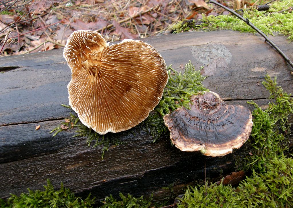Blättlinge wie der Tannenblättling (Gloeophyllum abietinum) sind schmächtiger im Wuchs und kommen überwiegend an Nadelholz vor.