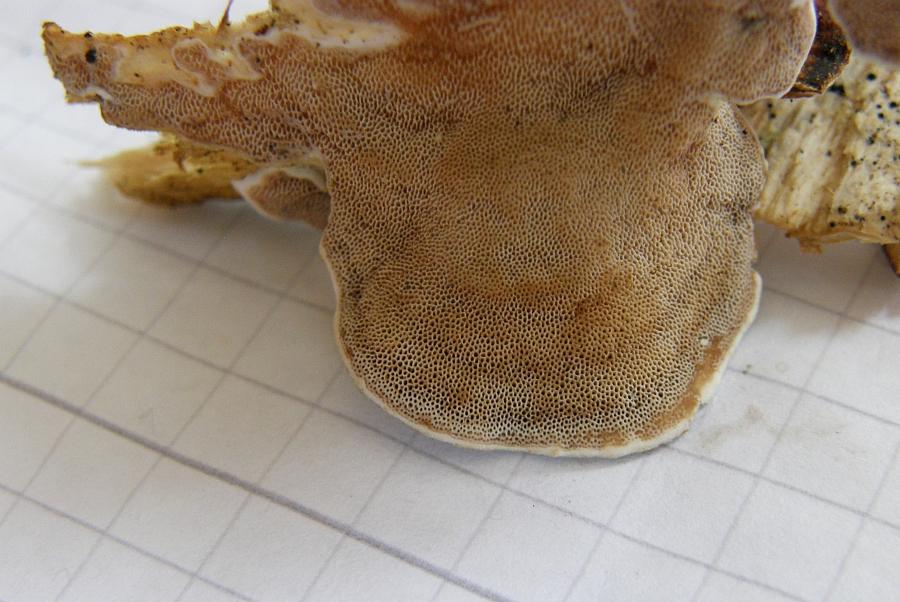 Die könnten zwar auch dazu gehören, mikroskopisch habe ich da nicht reingeschaut, aber die weisen doch einige Absonderlichkeiten auf. Da ist einmal der größtenteils resupinate Placken oben auf dem linken Stammstück, der blasser war und nur rudimentär Poren bildete. Allerdings lag direkt auf dem Placken noch ein dickerer Ast drauf. Konsistenz ist im Grunde so wie bei dem oben vorgestellten Pilz: