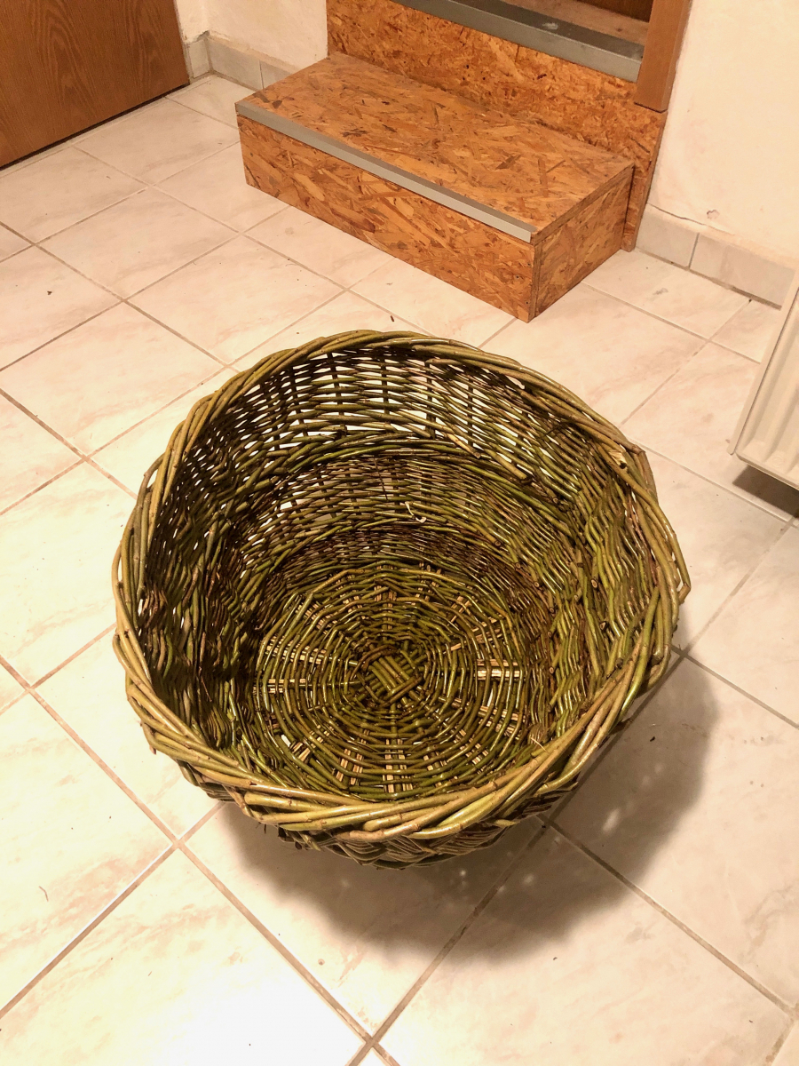• So. Hier ist nun der grobe 20-Liter-Holzkorb für den Schuppen. Ich habe ihn nicht weitergeflochten, weil ich frische Ruten verwendet habe und die ungeeignet sind. Lehrgeld. Im Sommer geht es mit dem richtigen Material weiter zum Pilzkörbchen.