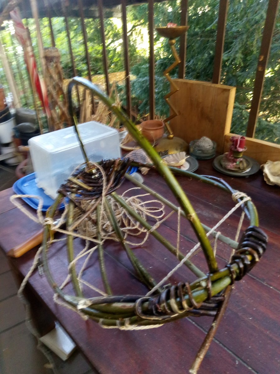 Danke. Wenn ich das rechtzeitig verinnerlicht hätte, würde ich ein kleines Körbchen geflochten haben. Egal. Dann beende ich das Flechtwerk jetzt mit einem Abschlusskranz und lasse die Henkel weg. Es wird dann nur für die kleinen Holzspäne im Holzschuppen genutzt. Die heutigen Weiden werden sortiert und getrocknet. Ein paar hole ich noch, dann ist mein Reservoir aufgebraucht.