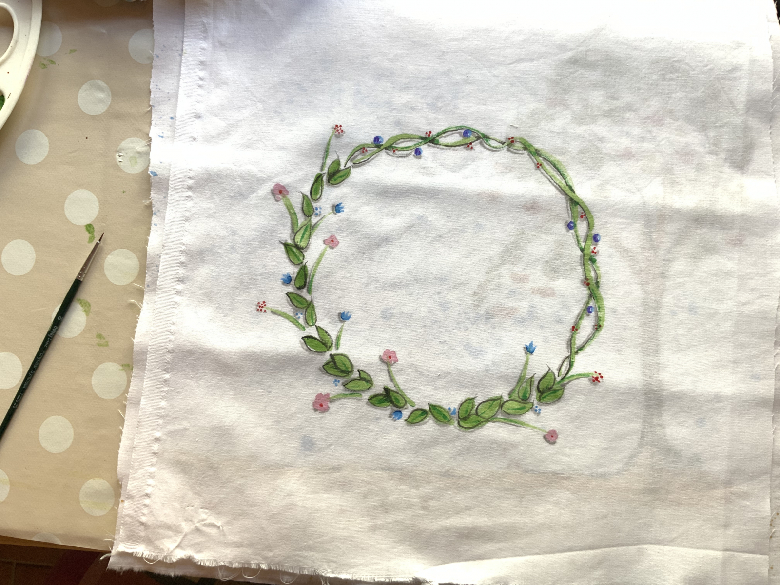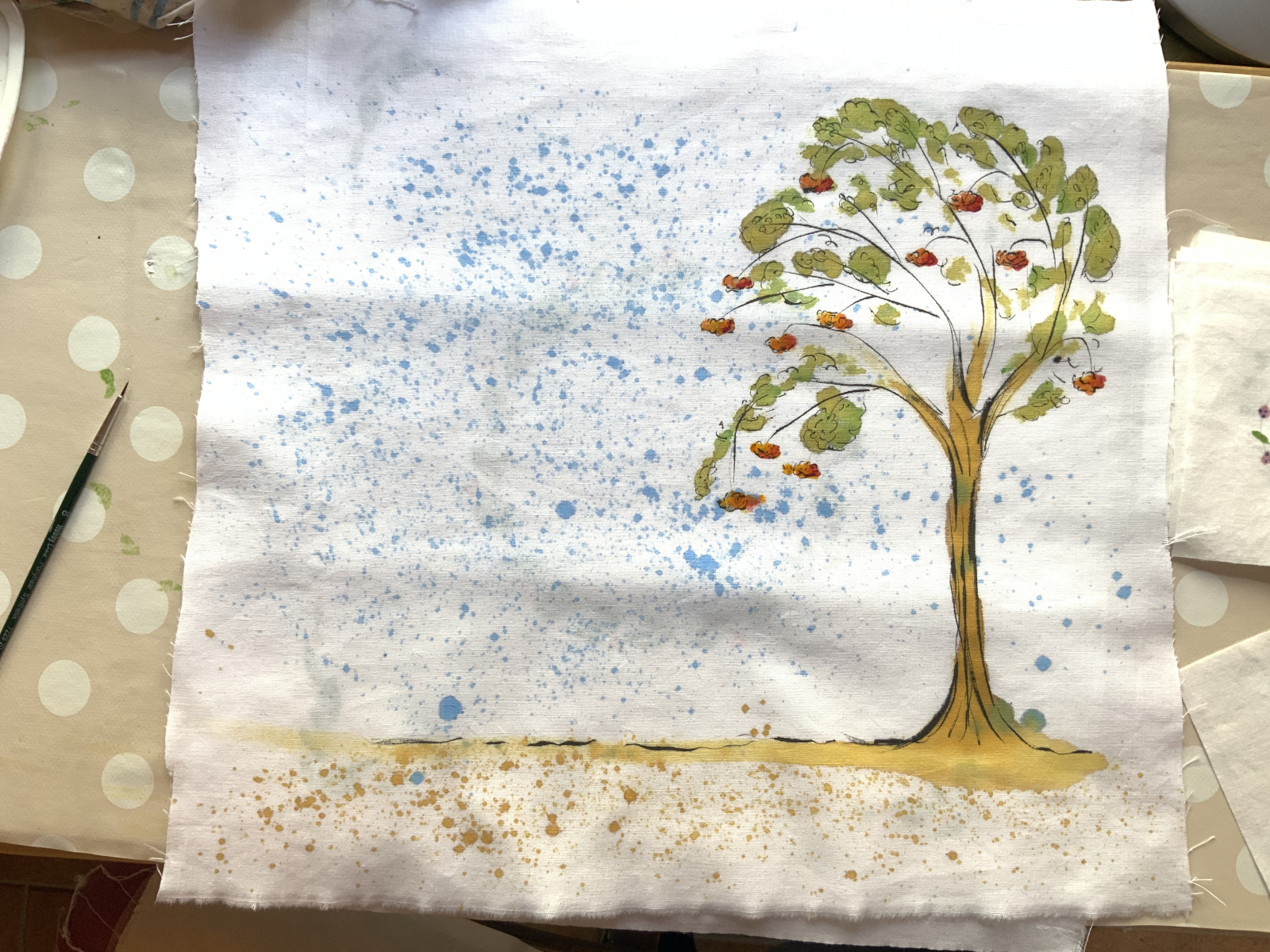 Mein neues Projekt (offenes Projekt Nr. 137) : Baumwollstoff mit eigenen Motiven und Stoffmalfarben bemalen, diese Stoffstücke dann in verschiedene Quilts einarbeiten.