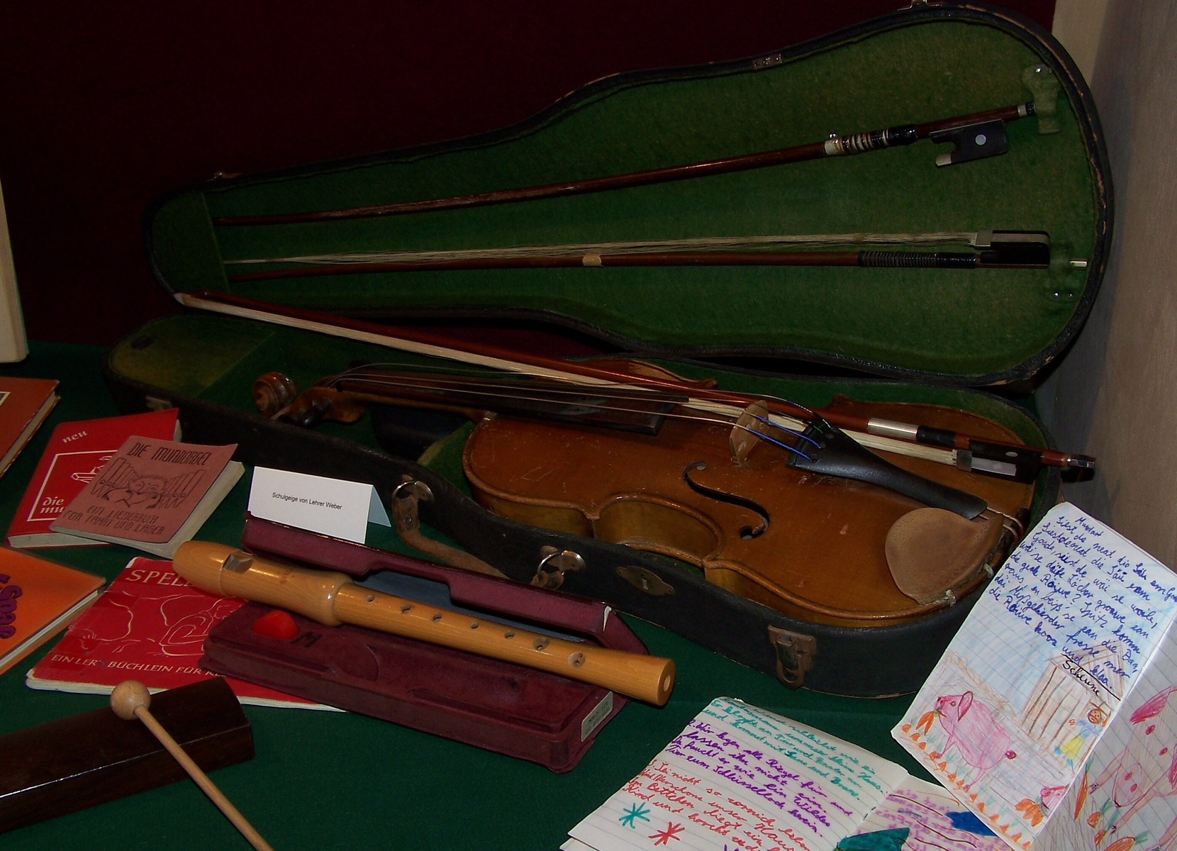 Ein schönes Fach: Musik! Diese Geige ist das Originalinstrument meines alten Grundschullehrers Willi Weber. Er spielte sie meistens als Zupfgeige, wie eine Gitarre, zur Liedbegleitung. Durch den Blockflötenunterricht quälten wir uns auch.