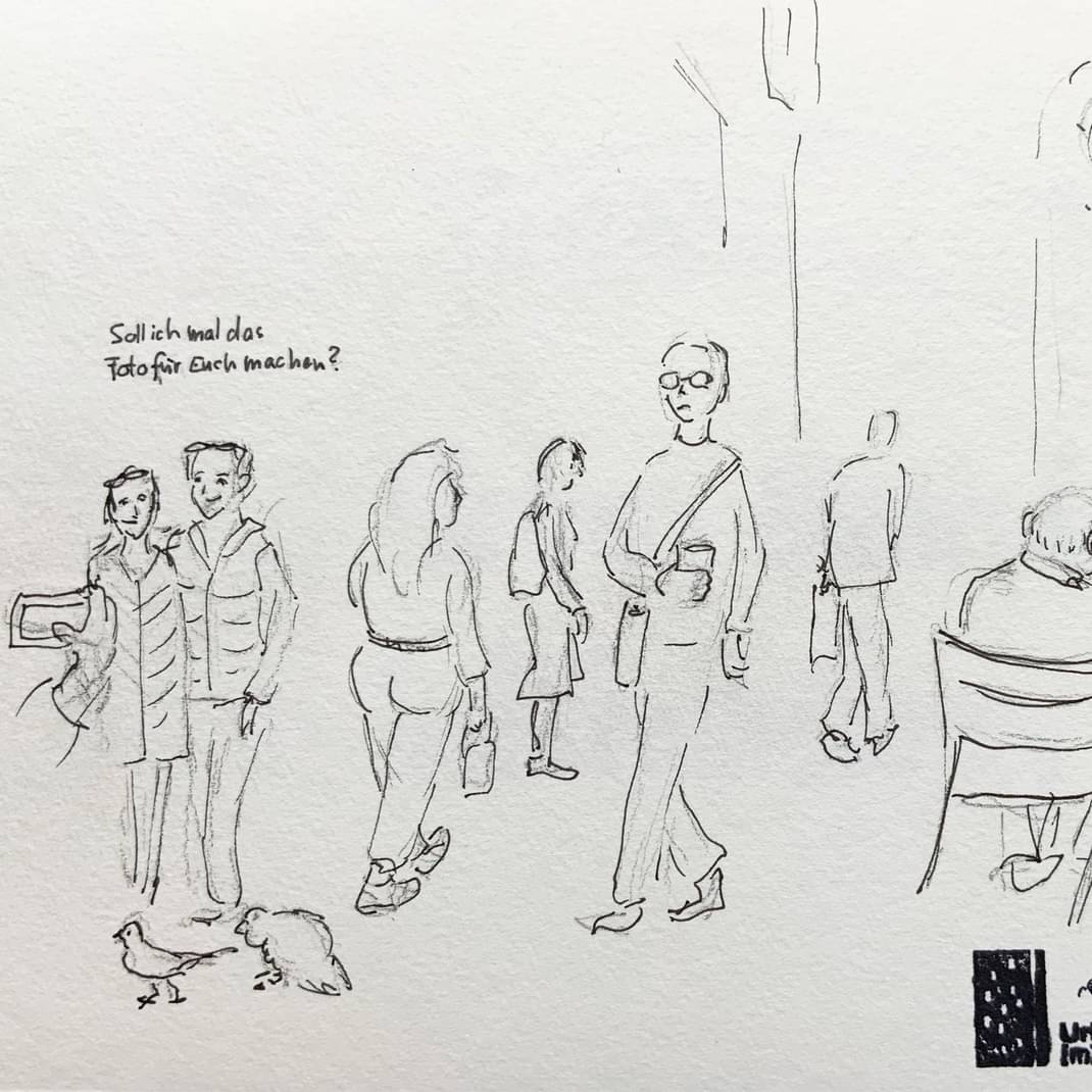 Es ging diesmal darum, Menschen zu zeichnen bzw. in die Skizzen mit aufzunehmen. Sowohl beobachten und erfassen als auch in reduzierte Darstellung standen auf dem Programm.