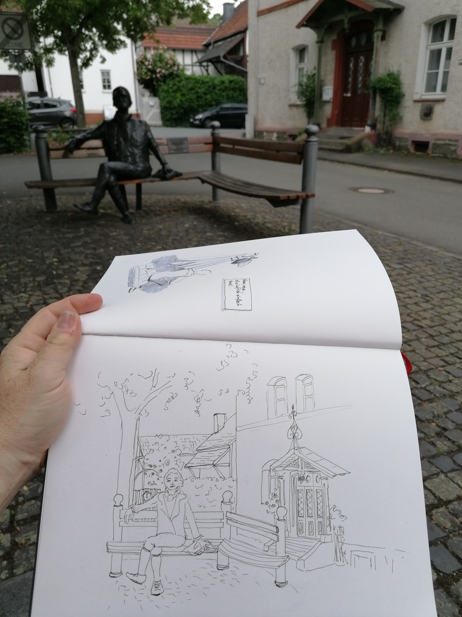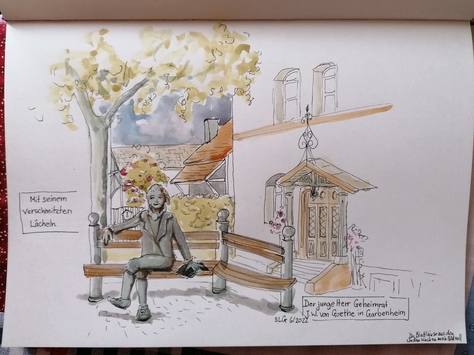 Gestern war ich mal wieder völlig unpilzlich unterwegs. Nach Feierabend mal ein bisschen malen, macht den Kopf frei. Und da es auch in unserem Dorf schöne Eckchen gibt, habe ich mich eine Stunde auf den Goetheplatz gesetzt und den Herrn Geheimrat gezeichnet.