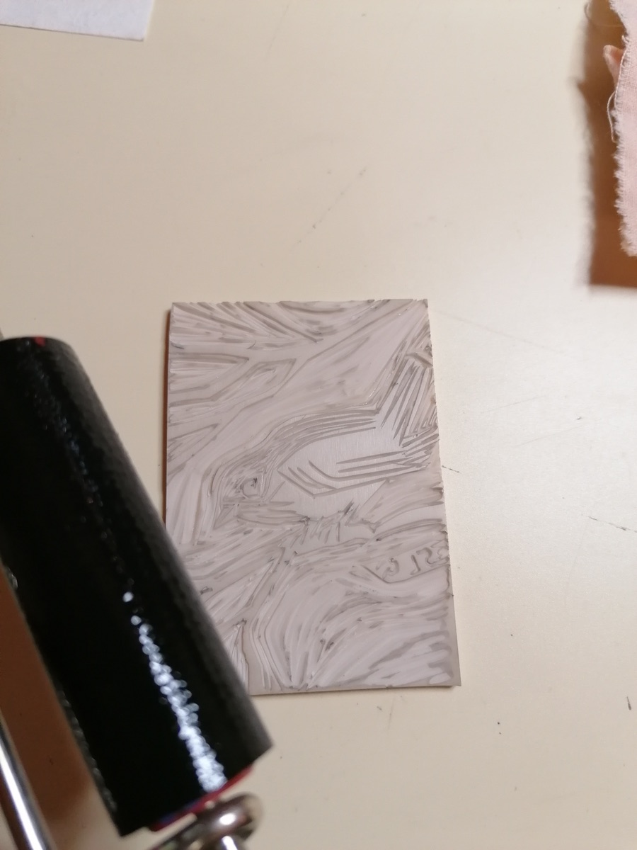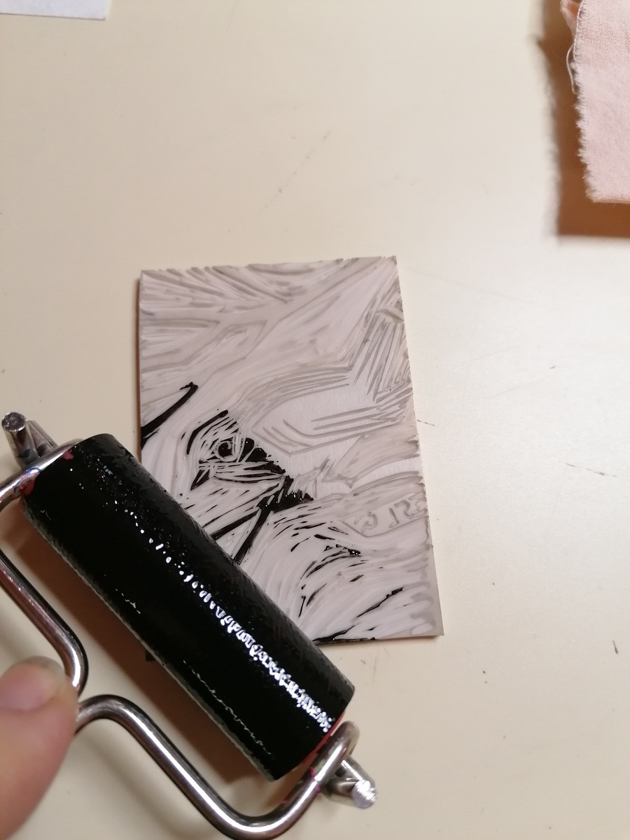 Ich hatte es auch erst mit einer Walze versucht, aber da nahm das Papier, wenn es etwas dicker ist, nicht genug Farbe auf und bei diesem dünnen Papier kam Farbe durchs Papier auf die Walze.