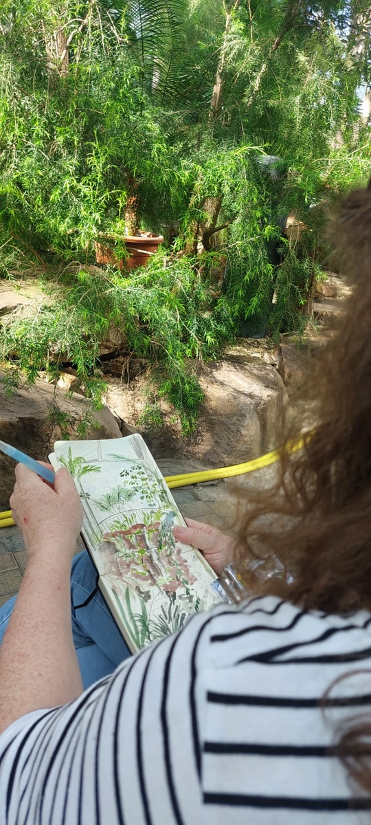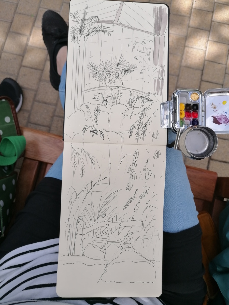 Gestern war ich mit der Familie im Palmengarten in Frankfurt. Eine Skizze habe ich zumindest hinbekommen. Das Format ist hier ein bisschen schwer darstellbar, es ist eine Doppelseite im Hochformat.