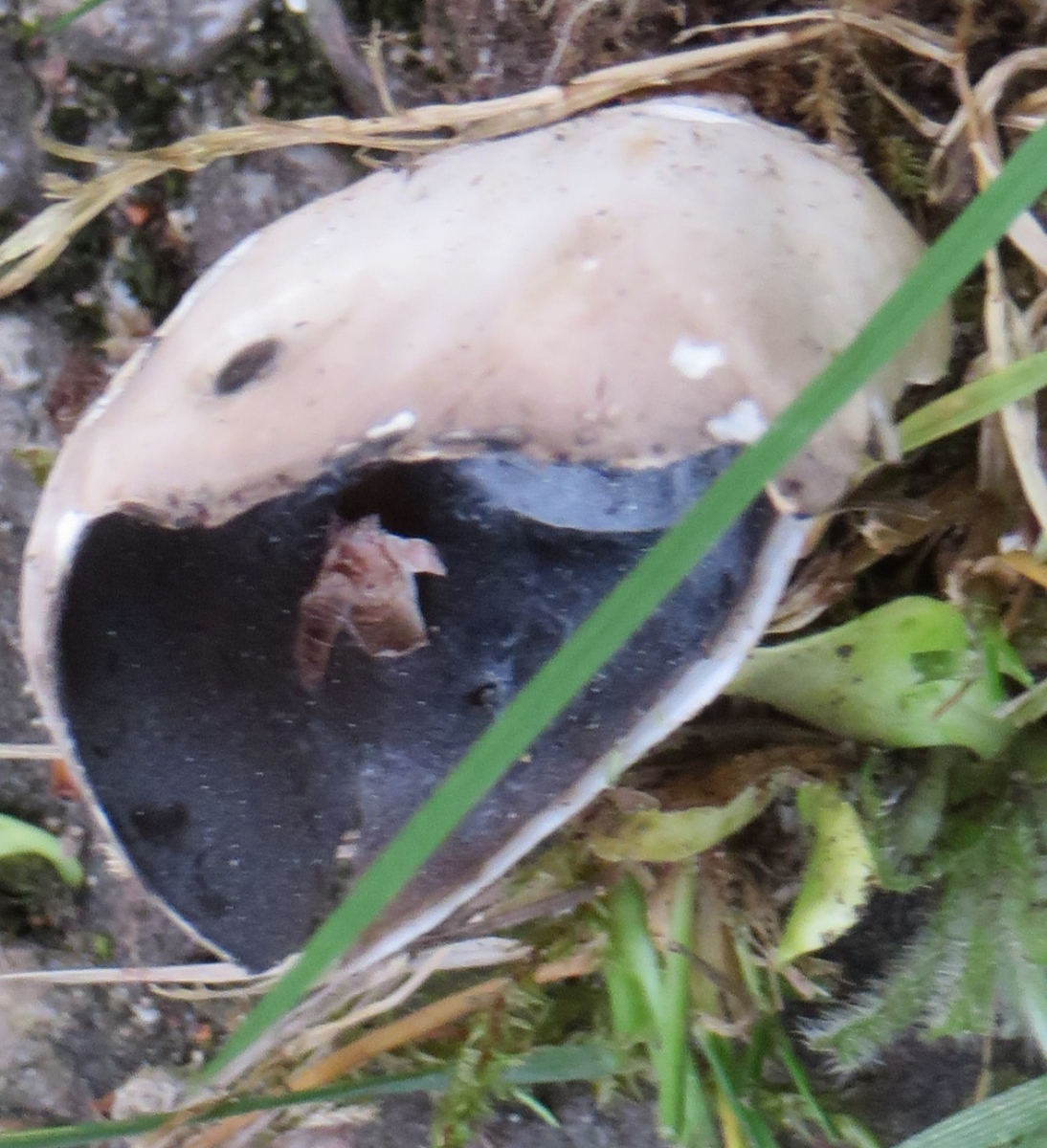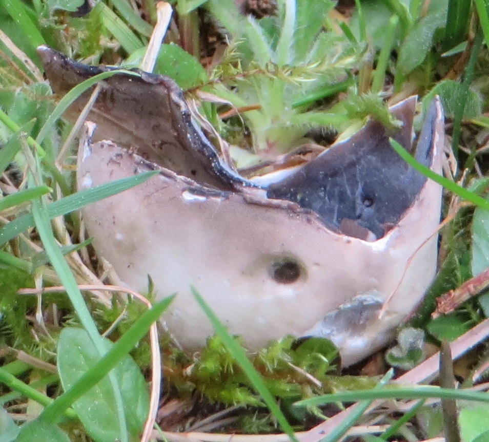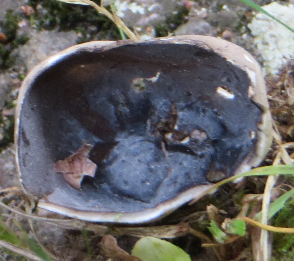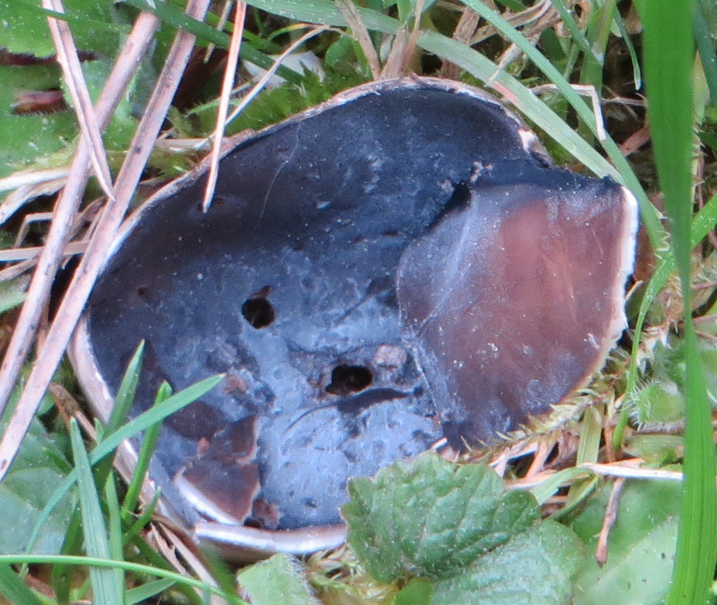 Erster Fund: c.a. 4-5 cm Durchmesser, außen weißlich, innen schwarzviolett, am Rand des Rasens nahe Waschbetonplatten - vermutlich ein Violetter Becherling (Peziza violacea):