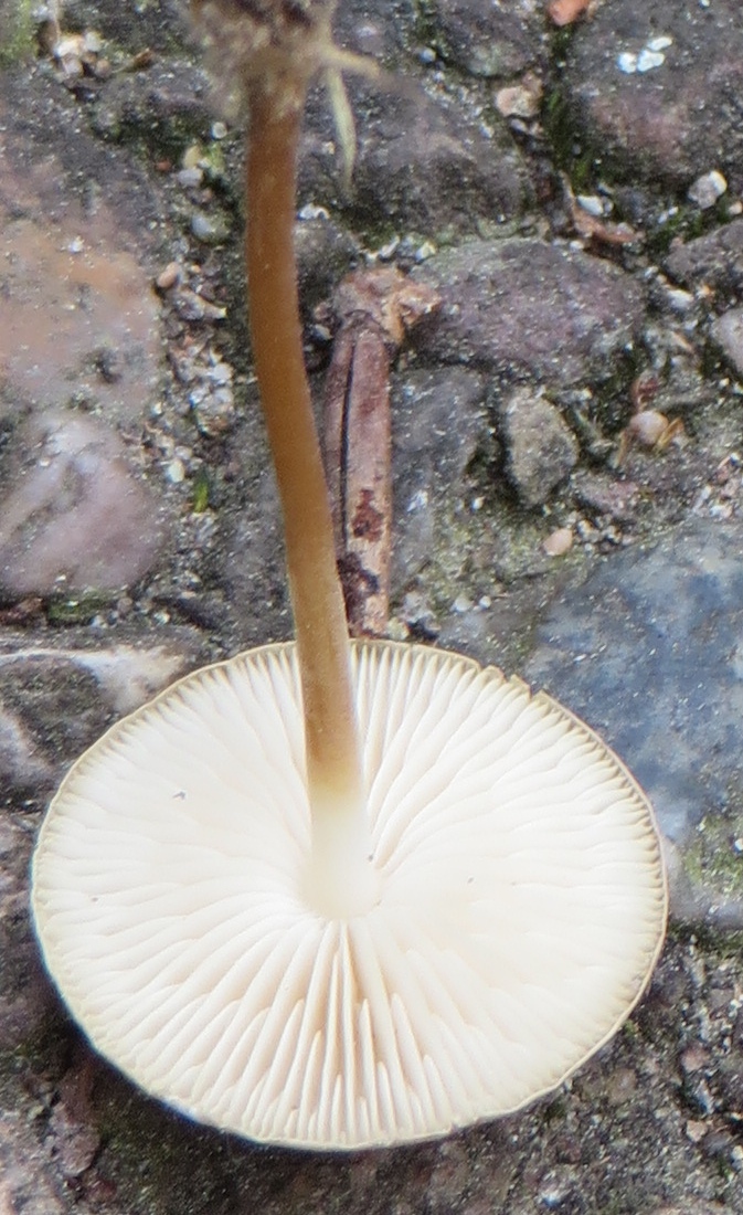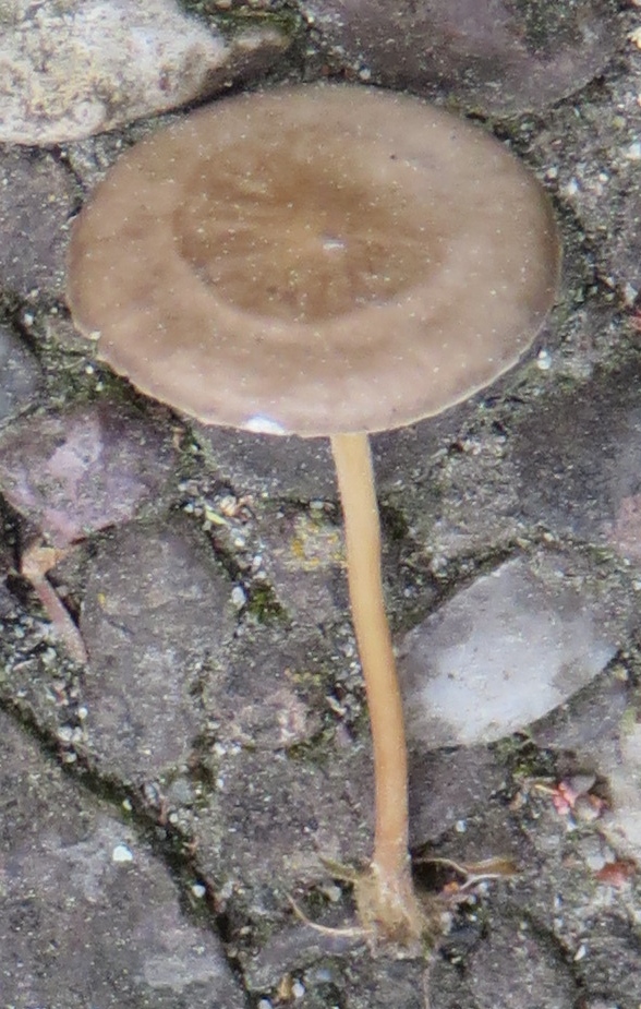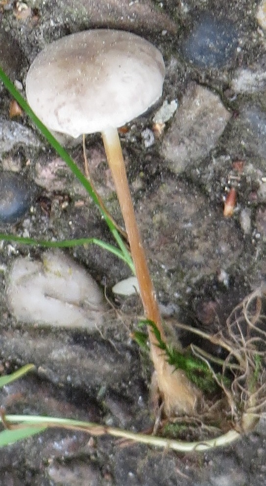 Zweiter Fund: Graubrauner Pilz, Durchmesser c.a. 2 cm, langer