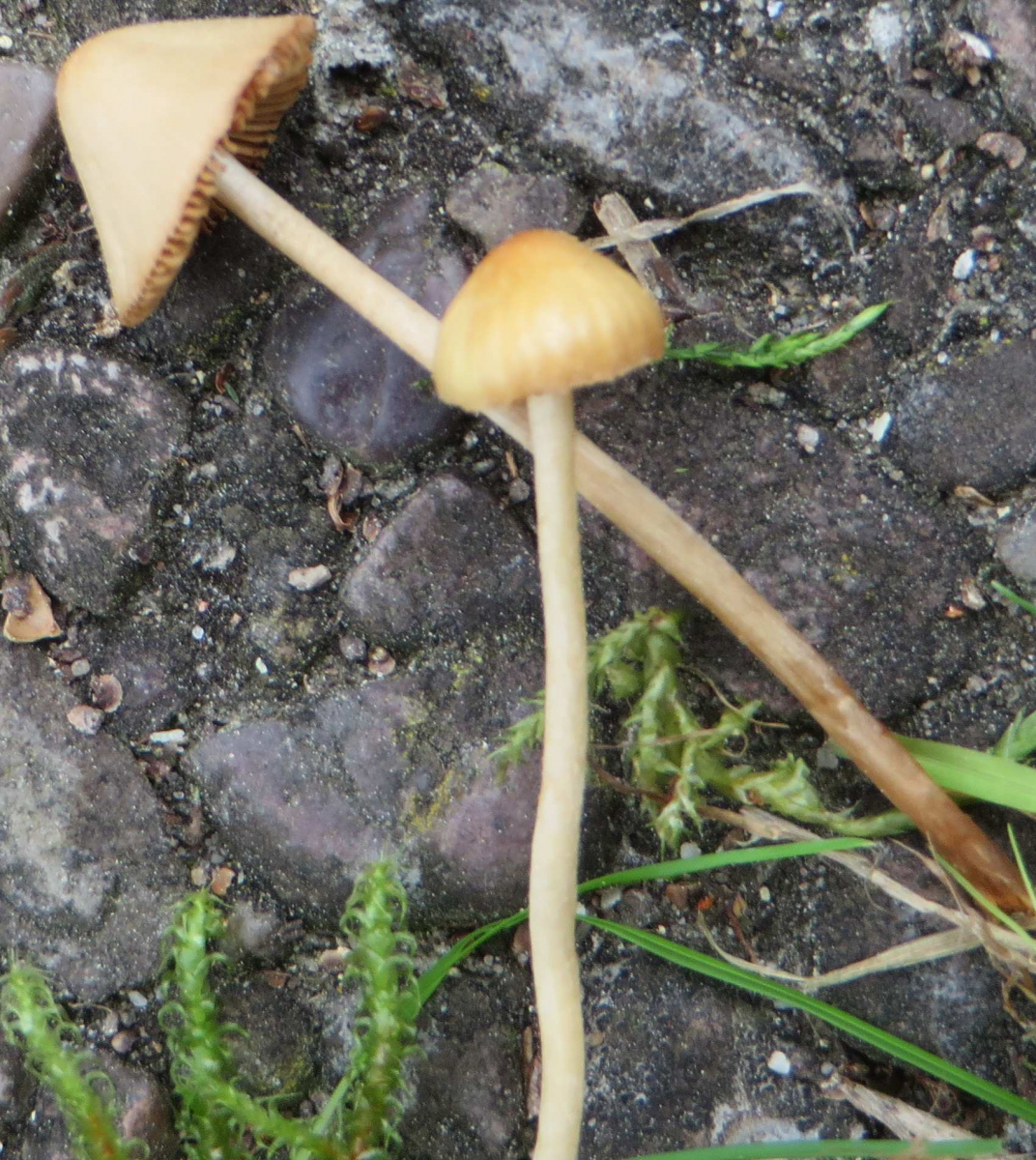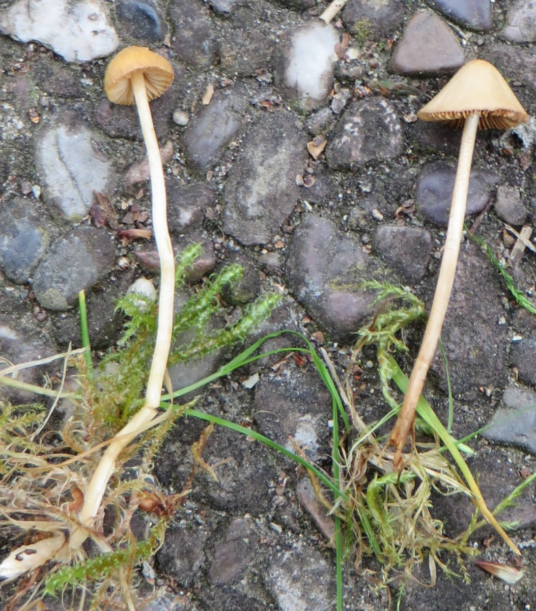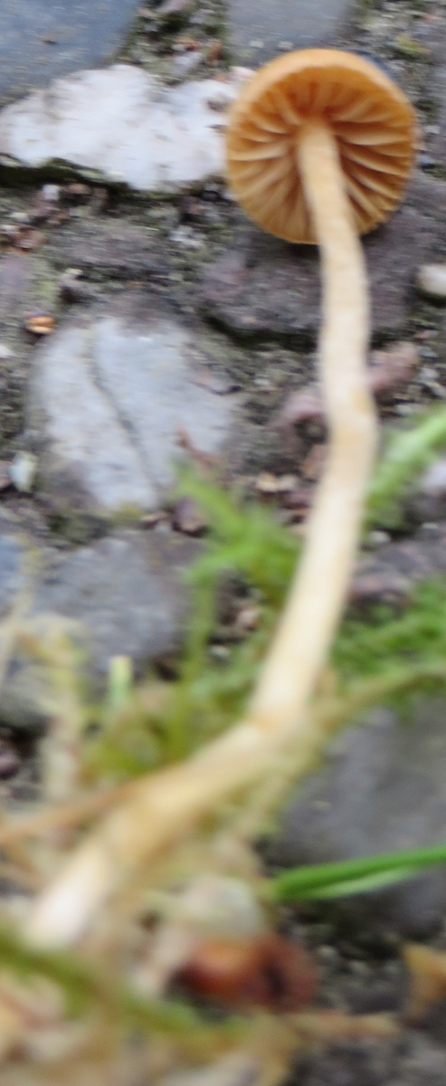 Dritter Fund: Zahlreiche jeweils einzeln stehende orangefarbene Pilze im moosigen Rasen, größter Hutdurchmesser 1,5-2 cm, sehr langer dünner Stiel, ganzer Pilz in Orangetönen (Stiel evtl. etwas blasser). Könnte das ein Großsporiger Häubling (Galerina clavata) sein?