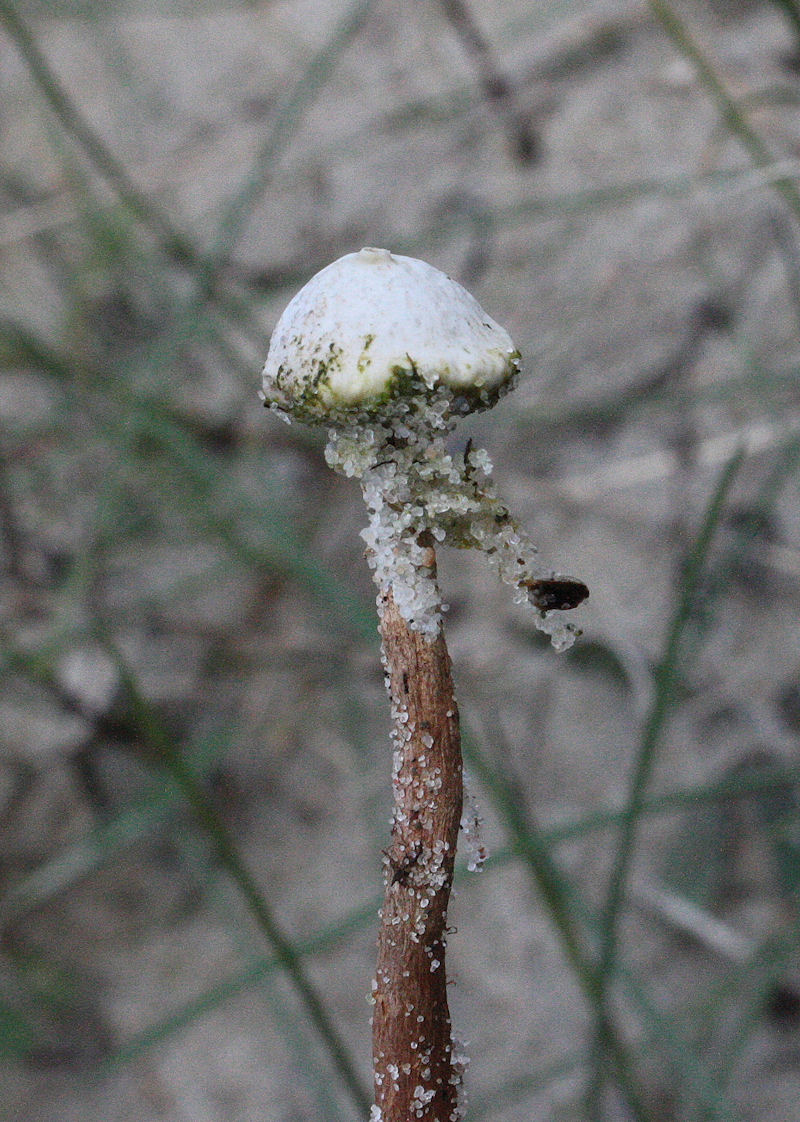 Zunächst wurde der Pilz als Zitzen-Stielbovist angepriesen, aber nach einigem Recherchieren bin ich da anderer Meinung. Es könnten auch beide Arten sein wenn man auf den Hof um die Peridie besonderen wert legt, denn viele Pilze standen zusammen von denen manche dunkle Höfe hatten, andere allerdings rein weiß waren. Ich denke aber es werden alles die gleichen sein und tendiere darum zum Dünen-Stielbovist.