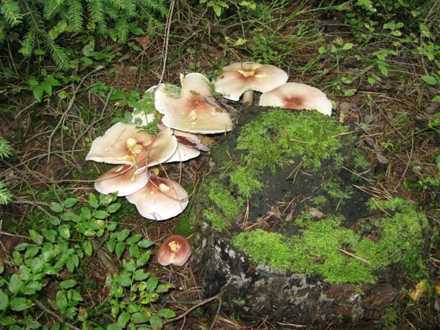 Die Pilze wachsen auf und bei totem Holz, die Bildfarben sind identisch.