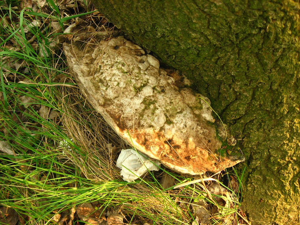 mir fällt da noch ein: Der Baumporling ist wohl sehr wahrscheinlich G. applanatum (Flacher Lackporling). Steffens andere Idee erschien uns dann doch etwas unwahrscheinlich; zumal sich die Porenschicht auch "bemalen" lies. Die genaue Bestimmung wird sowieso erst im Herbst erfolgen können, wenn sich Frank (Tomentella) das Ding mal ansieht.