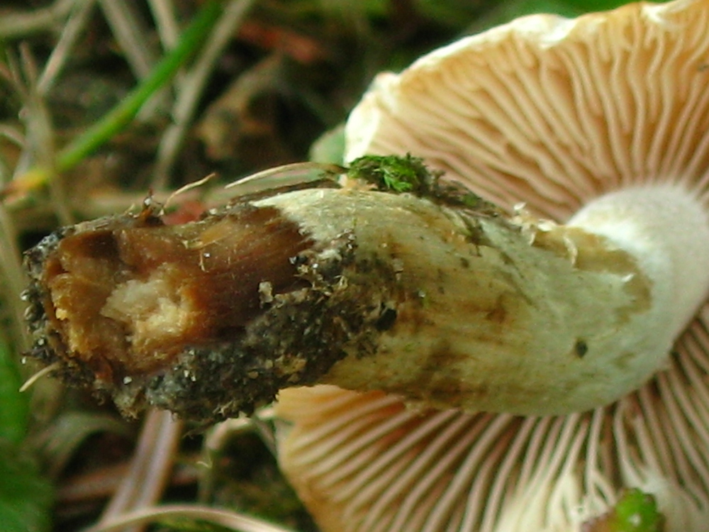 Stiel: Weiß, an der Stielspitze dunkelbraun verfärbend, am Übergang zum Hut mit glimmerigen Überzug außerdem halbhohl bzw. vollgestopft