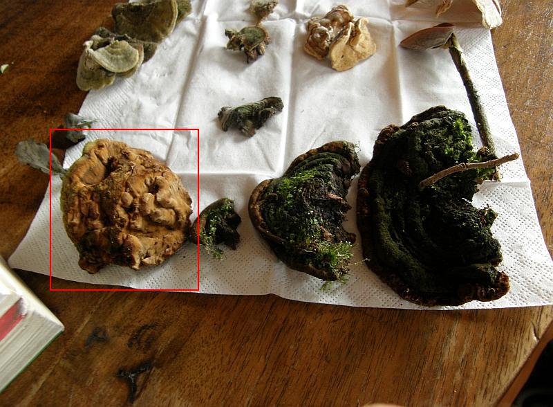 Bestimmt hatten wir die damals rein mikroskopisch wegen den sehr feinen Poren, bräunlichem Fleisch, wulstigen Zuwachskanten, Algenbewuchs, recht elastischen Hüten und dem vorkommen an Gesträuch als Strauchporlinge (Phylloporia / Phellinus ribis).