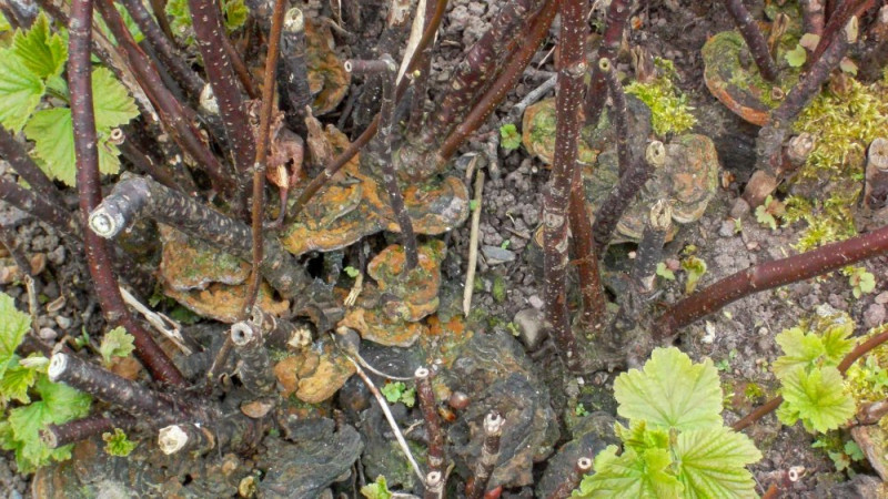 Ich kann dir leider nicht groß helfen, aber Strauchporlinge kenne ich aus dem eigenen Garten an Johannisbeere. Der Pilz ist recht harmlos, der Strauch erfreut sich bester Gesundheit. Die Fruchtkörper sind dünn und knapp über dem Boden. Auch beim Gartennachbarn war dieser Pilz (Foto).