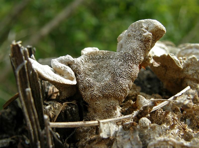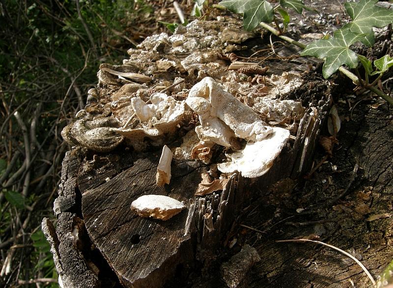 weißlicher Porling an Laubholzstumpf