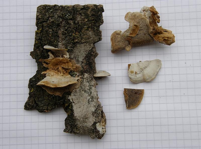 Da sieht man mal die Wuchsform an der Seite des Stammes an einem Stück Rinde, das ich mitrgenommen habe (ist das nun Birke?), und die Poren sowie Hutoberfläche noch im Detail.