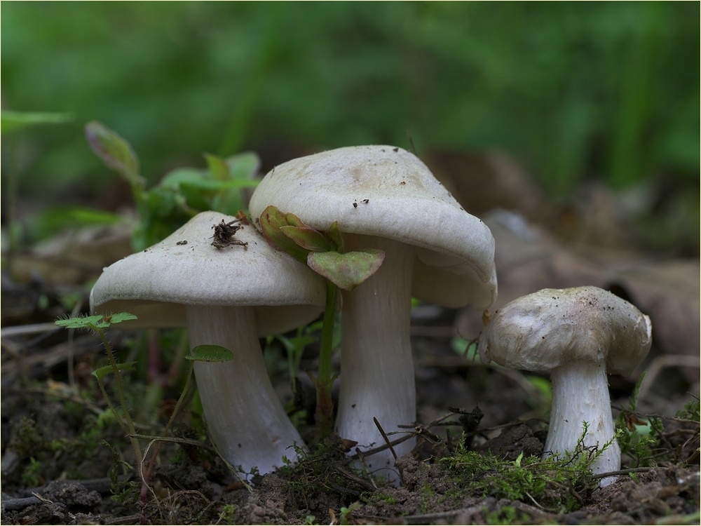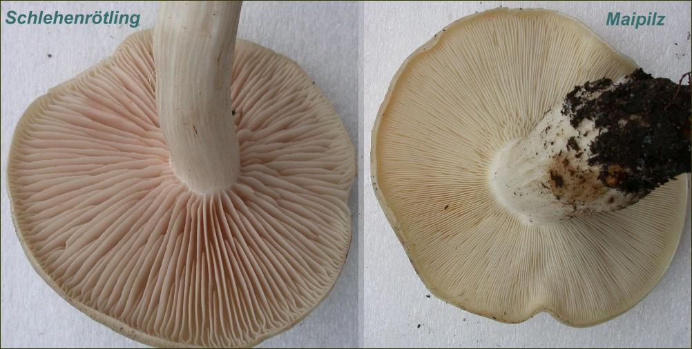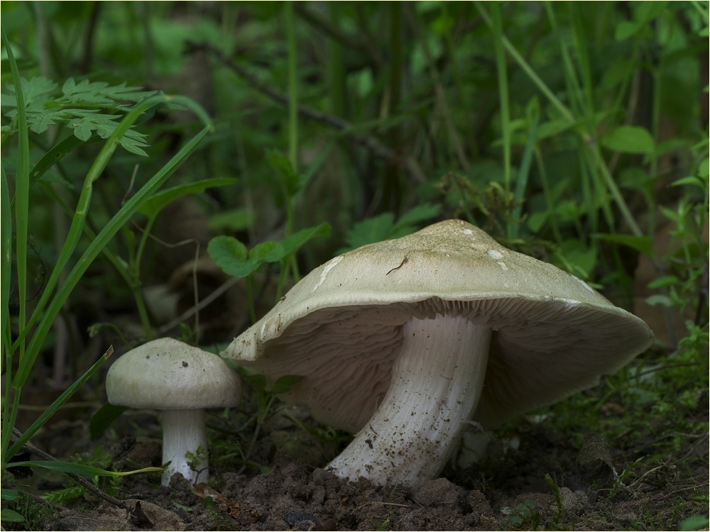 Aus der Nähe stimmten die Lamellen gar nicht. Sie waren deutlich weniger eng stehend und von blassgelb bei den kleinen Exempalren bis zu schmutzig rosa bei den großen Pilzen. Mit dem Feststellen des Geruchs habe ich momentan ein Problem und daher rochen sie gar nicht.