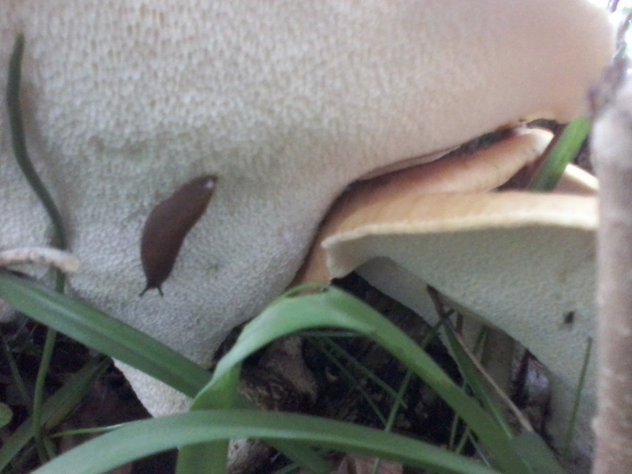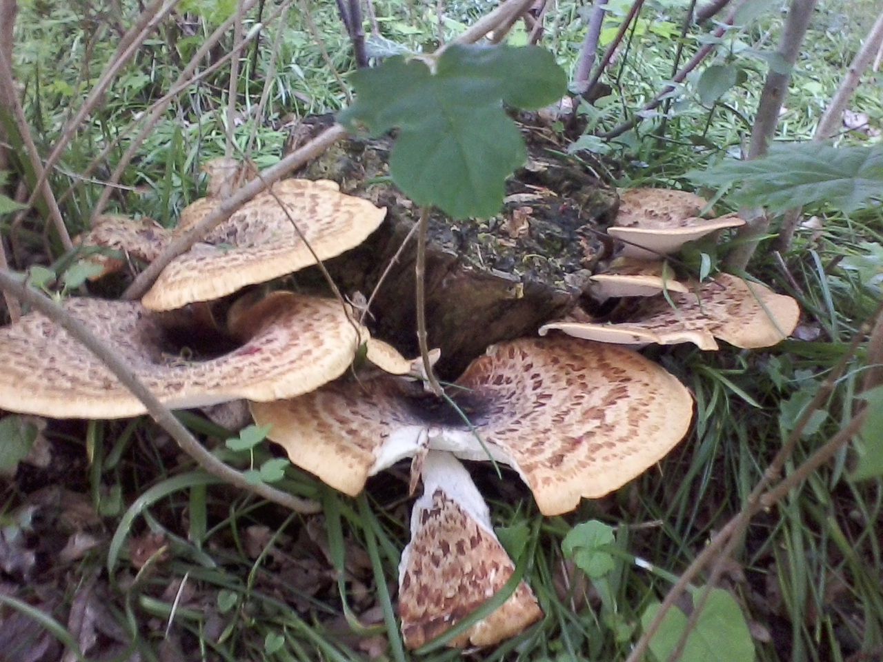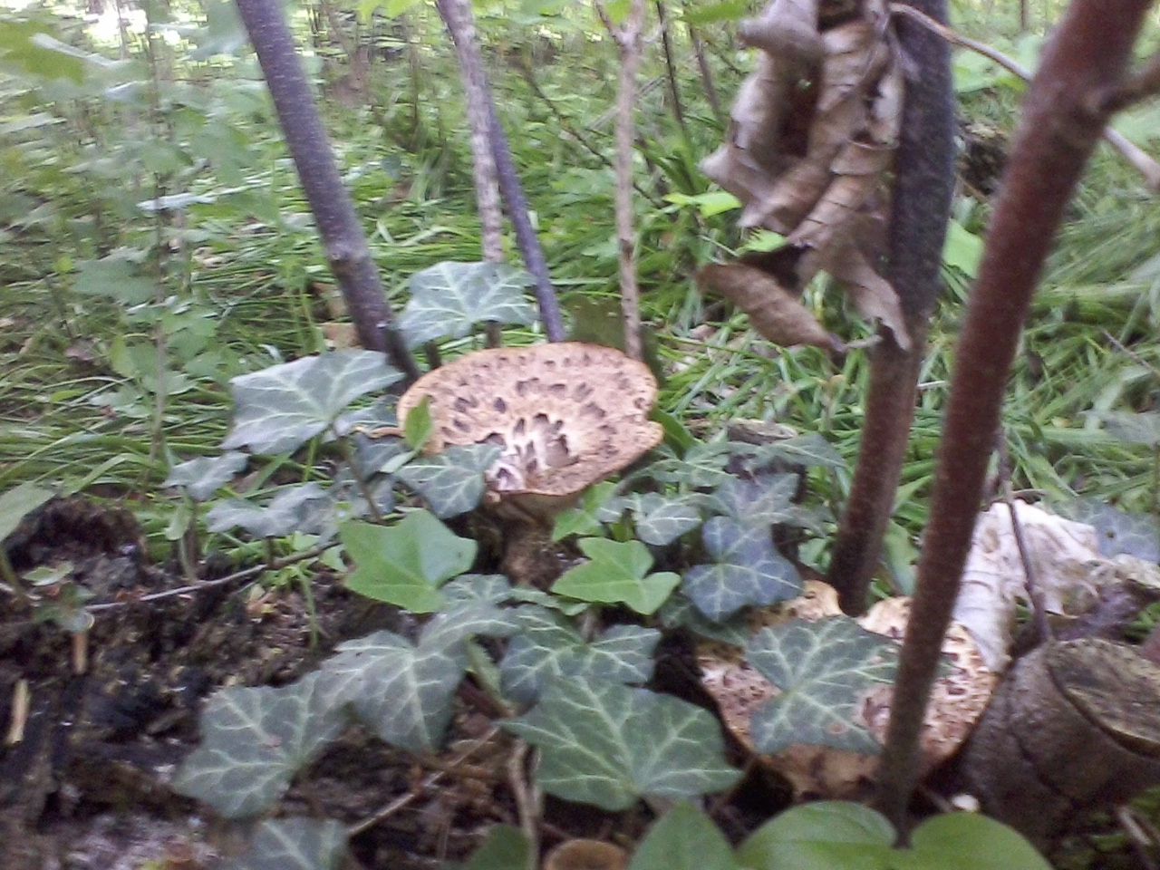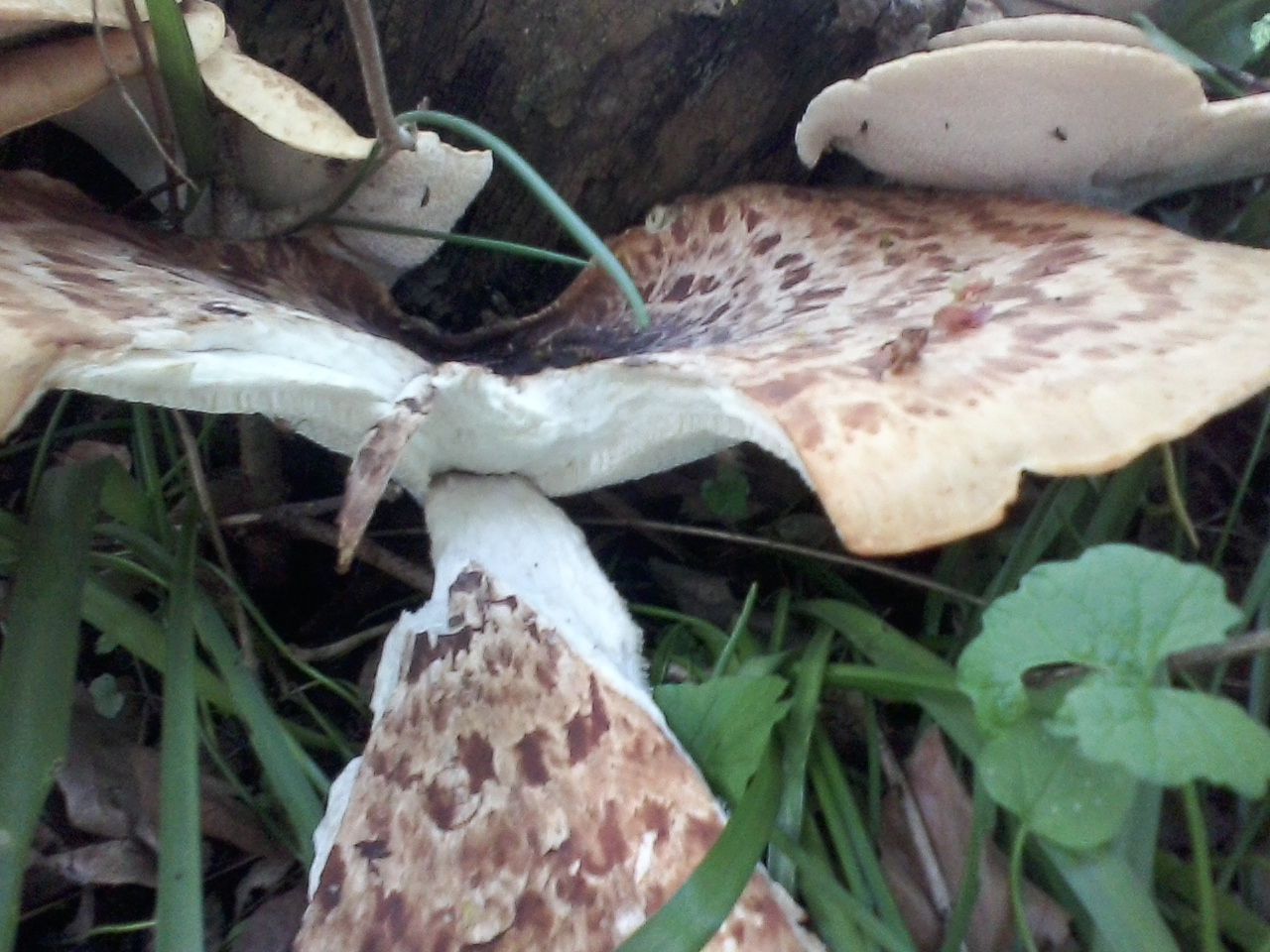 Meine Bücher haben mich auf den Schuppigen Porling gebracht. Ich habe keinen der Pilze mitgenommen, weil mir das irgendwie leid getan hätte - von einem kulinarischen Zweck bin ich nicht ausgegangen, also hätte ich das "Muster" einfach wegwerfen müssen. Deswegen kann ich über Konsistenz, Schnittbild, Geruch usw. nichts sagen. Die Bilder sind zwar unscharf, geben aber die Farben 1:1 wieder. Man sieht auch Ober- und Unterseite, Stiel und Anordnung. Seht Ihr Euch trotz des dürftigen Materials in der Lage, meinen Verdacht zu bestätigen? Solche Riesen dürften ja nicht allzu oft auftauchen in der hiesigen Pilzwelt.