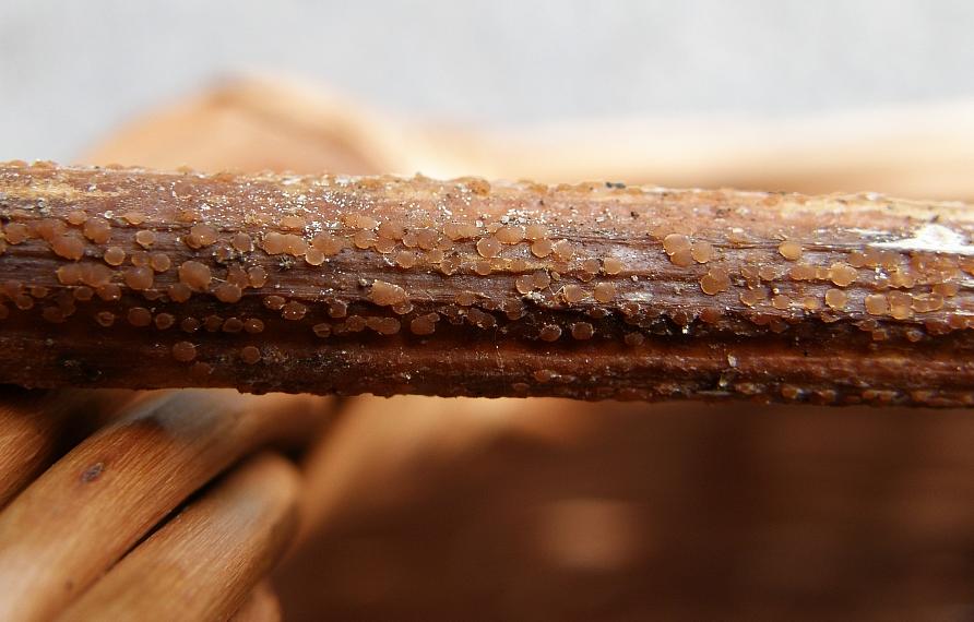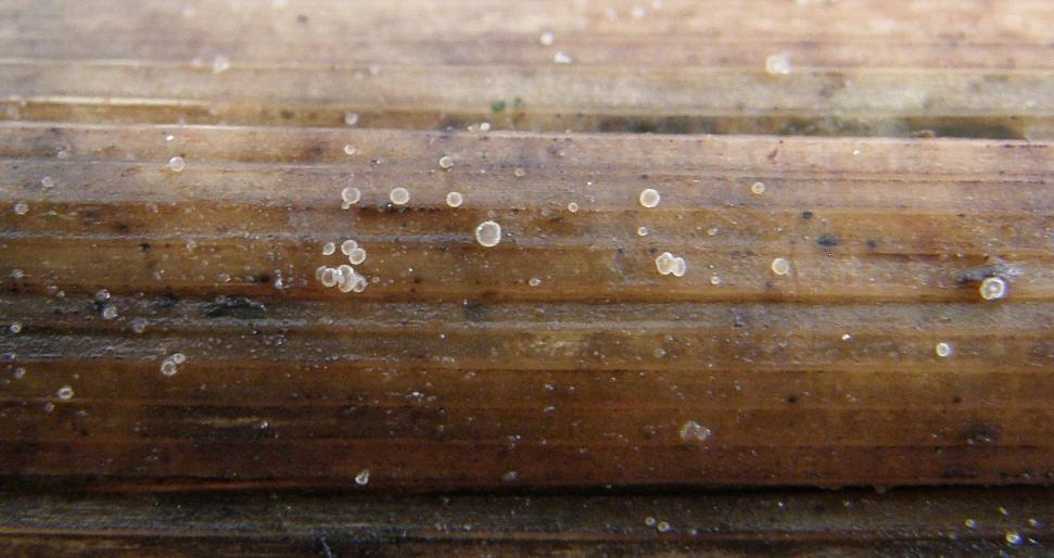 Gestern war eine kleine Gruppe Vogel- und Pilzgucker unterwegs in einer hübschen Wiesenlandschaft in der nördlichen Oberrheinebene bei Rot - Malsch. Dort durchziehen einige Wassergefüllte Gräben die Wiesen und Raine, was nicht nur den Störchen gefällt, sondern auch dem Schilfrohr. Neben einem Weg lagen auch einige vorjährige Stengel herum, an denen befanden sich kleine, hyalin - weißliche Becherchen.