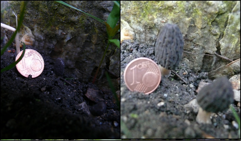 Ich bin ganz fest davon überzeugt, dass wir zwei verschiedene Arten von Spitzmorcheln im Garten hatten. Denn die einen waren von Anfang an fast schwarz und in der Wuchsform durchschnittlich viel spitzer, als die anderen, die zu Beginn grau waren (teilweise sogar hellgrau) und erst mit dem Wachstum etwas dunkler wurden und der Farbton schließlich ins bräunliche und dann zum Teil ins Dunkelbraune umschlug (aber eben auch nur teilweise). Die schwarzen Morcheln schienen auch von der Wabenartigen Struktur her ein wenig anders auszusehen und vor allem war das Hutfleisch viel dicker und dafür die Hohlräume viel kleiner. Bei den helleren Exemplaren hingegen war das Hutfleisch nur sehr dünn.