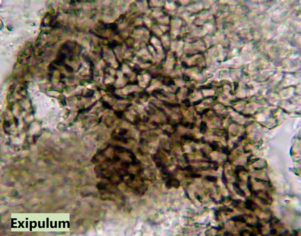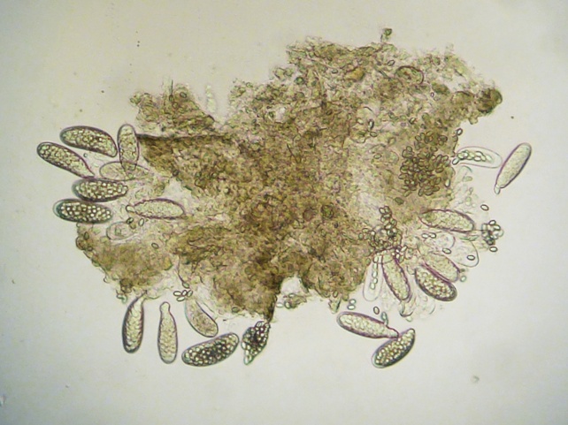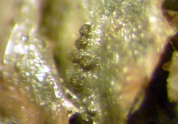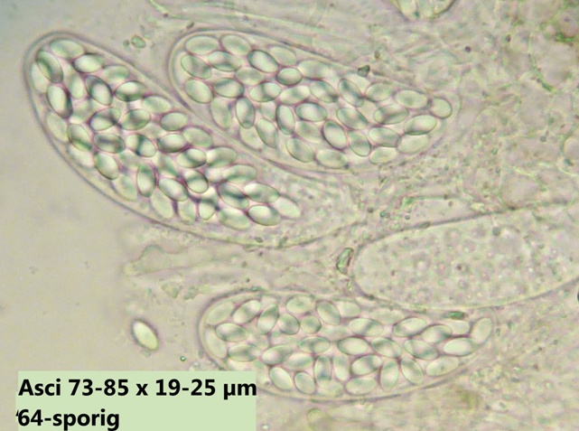 Makroskopisch bereits am krustenförmigen Wachstum zu erahnen, lassen die 64-sporigen Asci keine Zweifel.