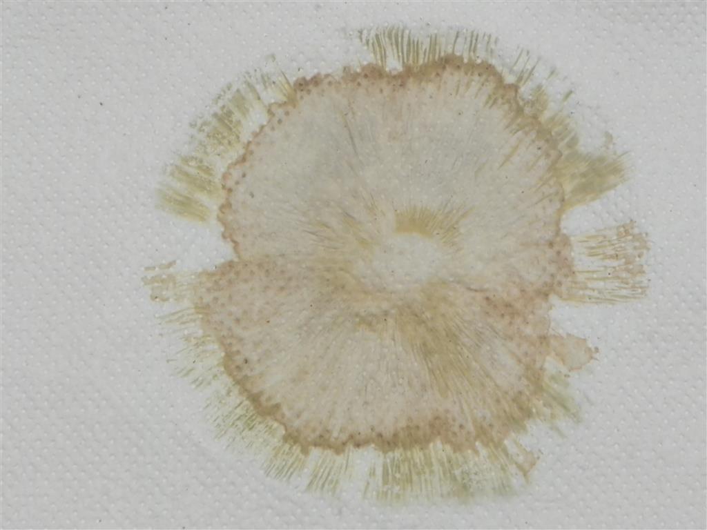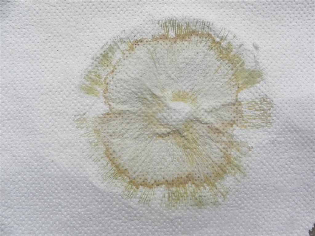 • hier mein versuch eines sporenabwurf bildes, die "strahlen" am rand sind olivgruen der innere teil eher braun bis okkerfarbig. Ob das oxydation ist kann ich nicht sagen waere allerdings bei den hier herschenden raumtemperaturen (28-30 grad) gut vorstellbar. Sollte nichts damit anzufangen sein werd ich den versuch gerne bei der "naechsten ernte" wiederholen. (habe eben 2 neue gesehen, fuer weitere bilder, bitte melden, leider hab ich keine makrofunktion an meinem knipser)