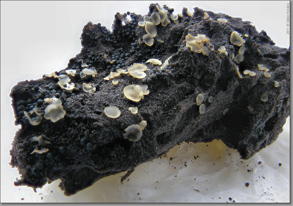 Ein dünner, optimalmorscher Laubholzast lag teils in Laubstreu eingebettet am Rand der Senke. Unterseits bedeckt mit etlichen, gar nicht mal so kleinen Bechern. Die sind sehr flach, dünnfleischig, hyalin weißlich bis ockergelblich.
