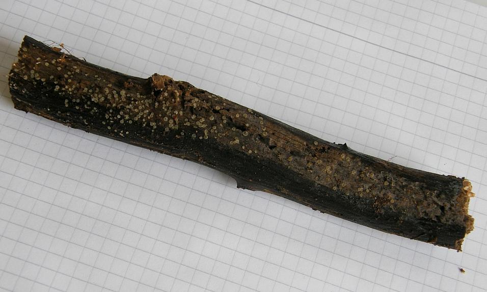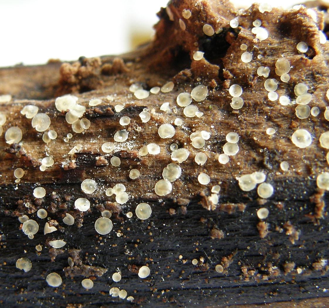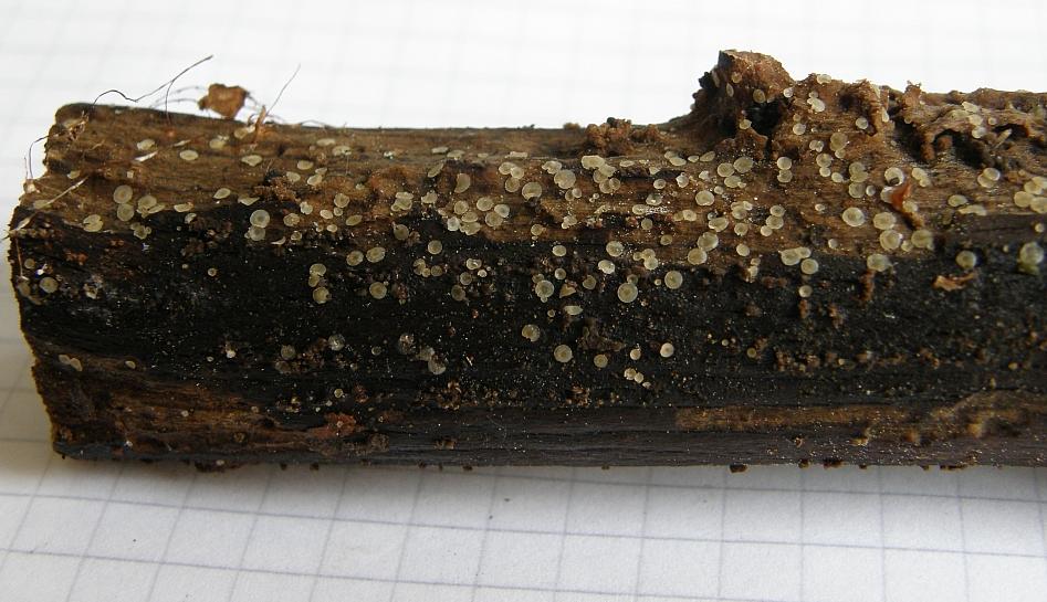 Ein dünner, optimalmorscher Laubholzast lag teils in Laubstreu eingebettet am Rand der Senke. Unterseits bedeckt mit etlichen, gar nicht mal so kleinen Bechern. Die sind sehr flach, dünnfleischig, hyalin weißlich bis ockergelblich.