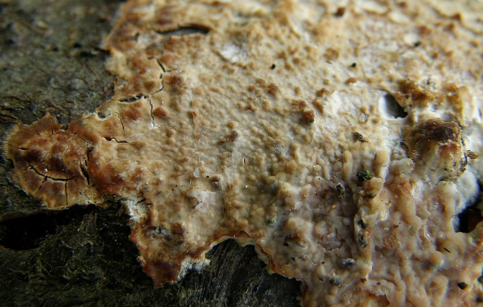 Farblich größtenteils recht blass, teilweise aber rotbräunlich eingefärbt, was auch an der Trockenheit liegen kann. Frischer Fruchtkörper ist wachsartig, vom Substrat ablösbar und sitzt auf einem weißlichen Filz.