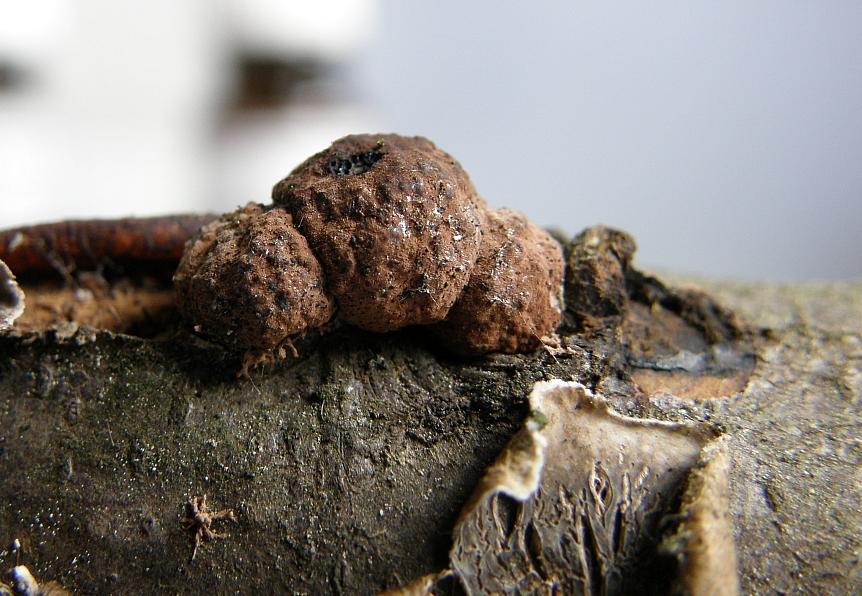 Eine Nebenfruchtform, die endlich auch mal für mich verständlich diskutiert wurde (siehe link oben). Wer das Bild mal anklickt (Dann wird–™s größer) kann noch einen weiteren, sehr kleinen gelblichen Pilz entdecken. Der leider nicht untersucht wurde, aber trotzdem >Tubeufia cerea< sein könnte.