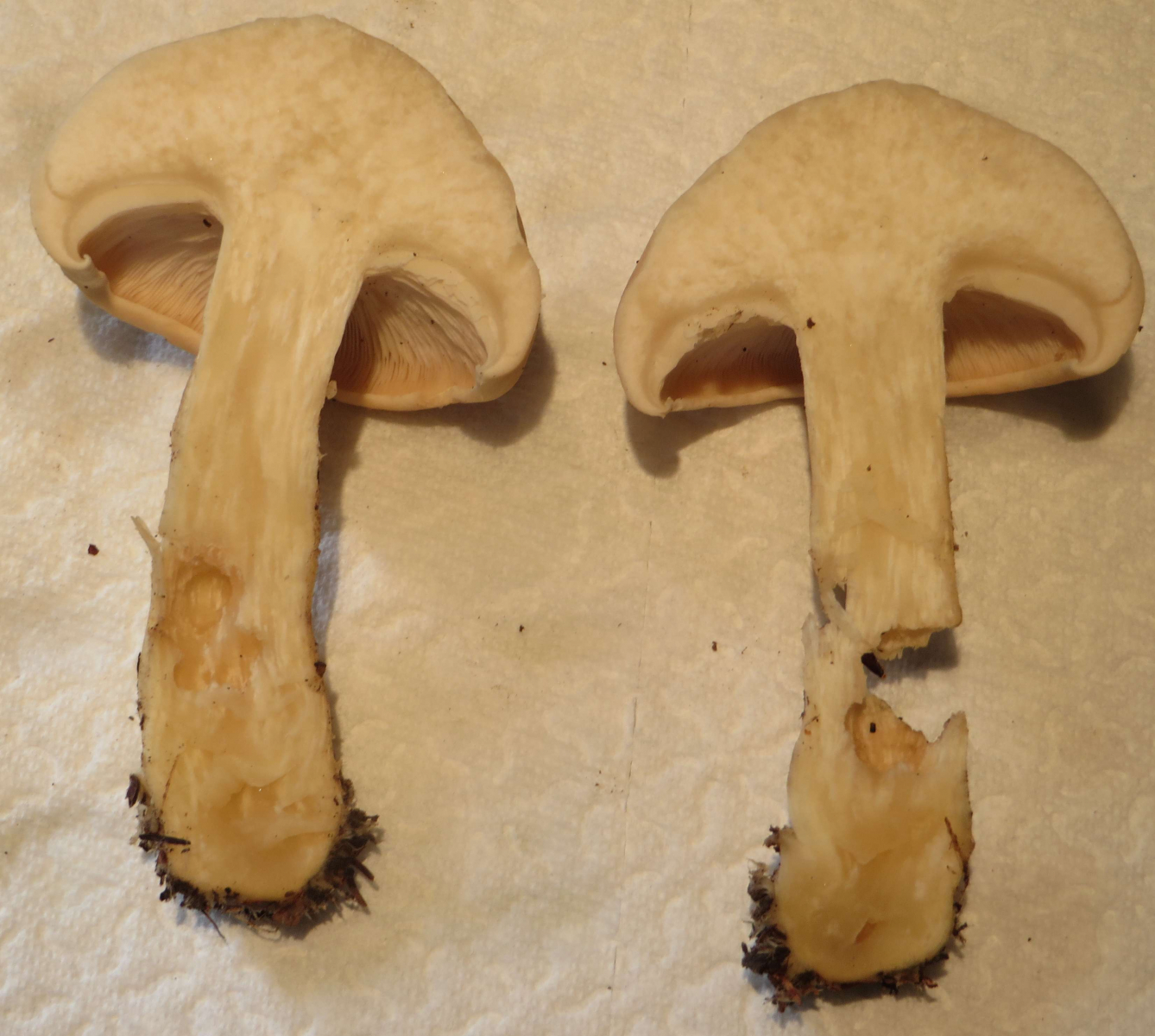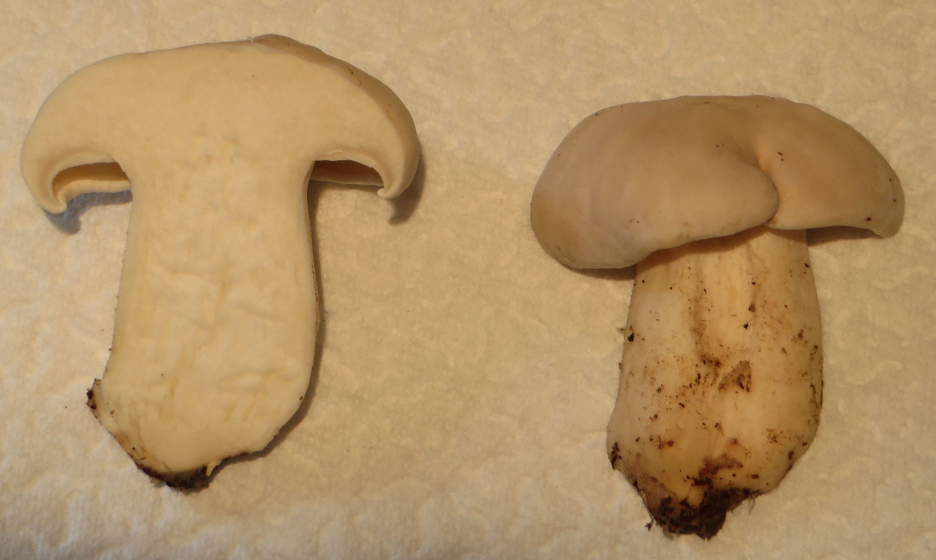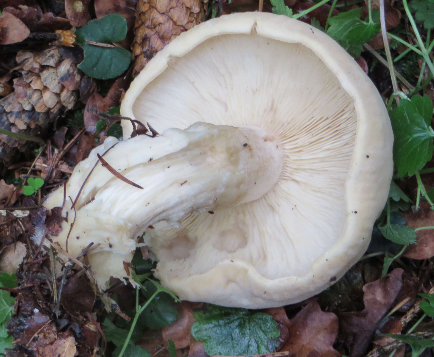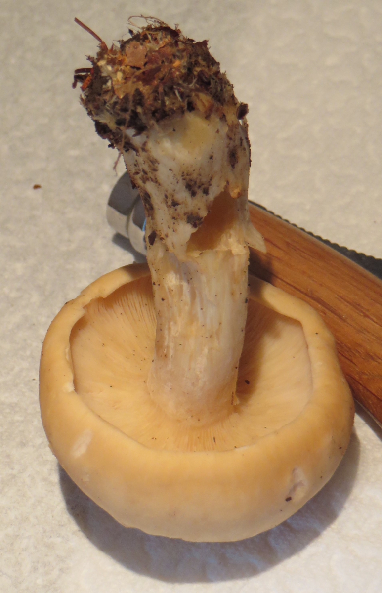 Eingerollte Hutränder, teils sehr dicke Stiele (4-5 cm), sehr dünne Lamellen im Gegensatz zu sehr dickem Hutfleisch, Lamellen dicht stehend, Geruch und Geschmack nach Salatgurken (zum Vergrößern doppelt anklicken):