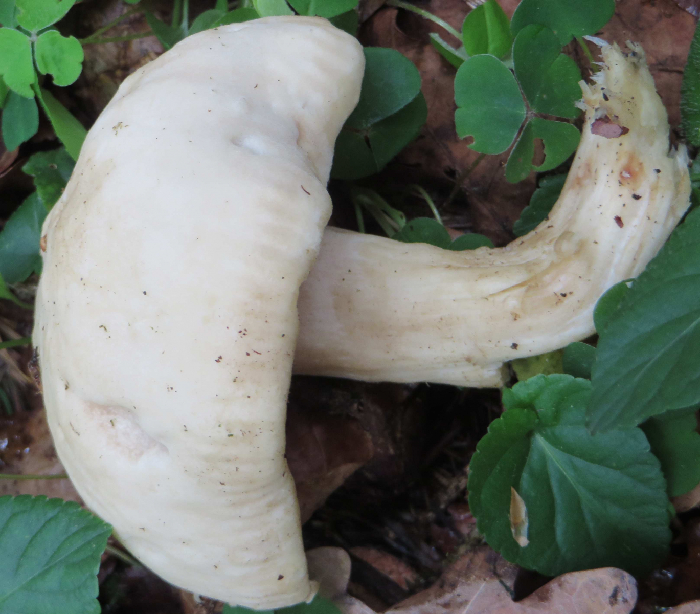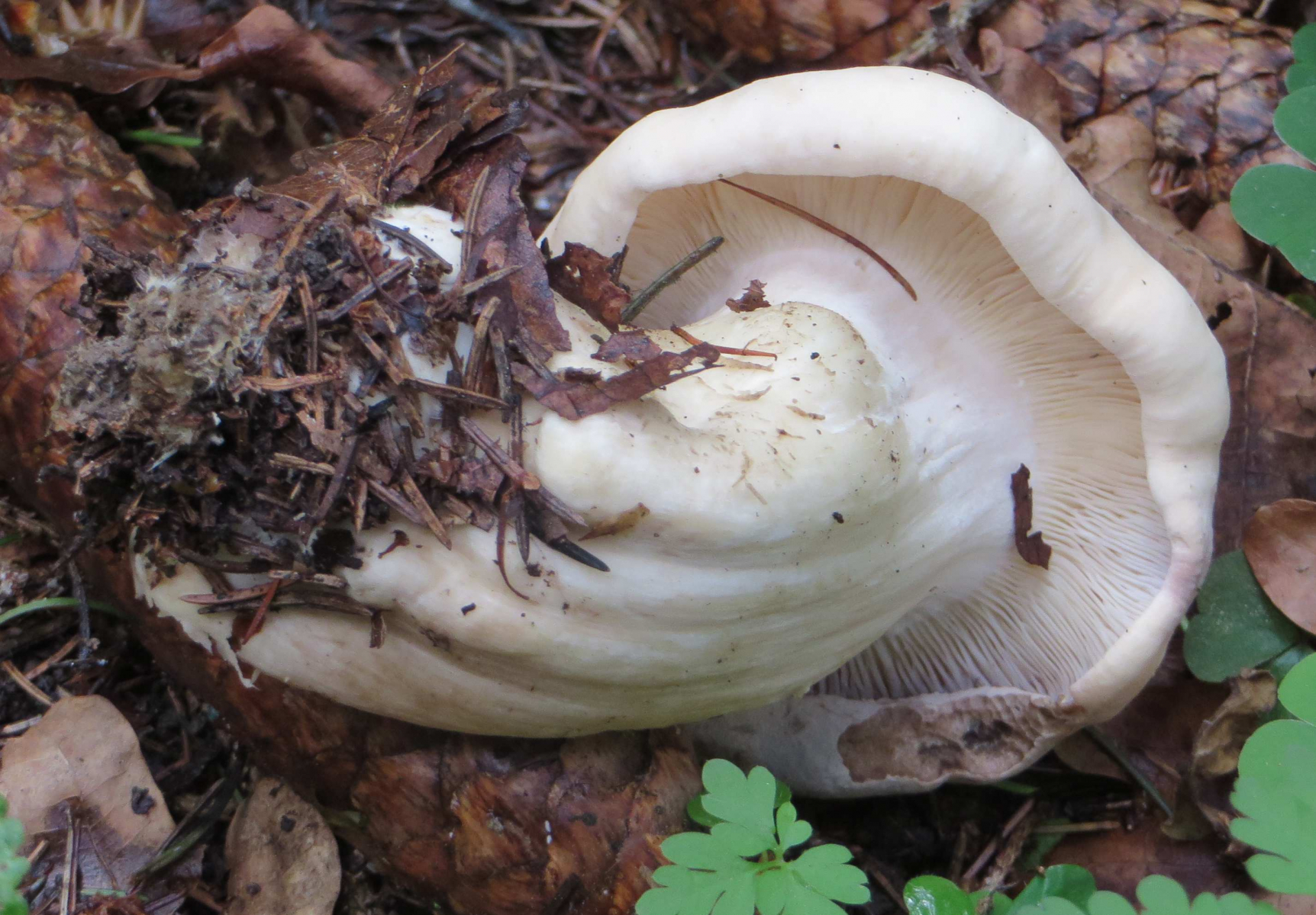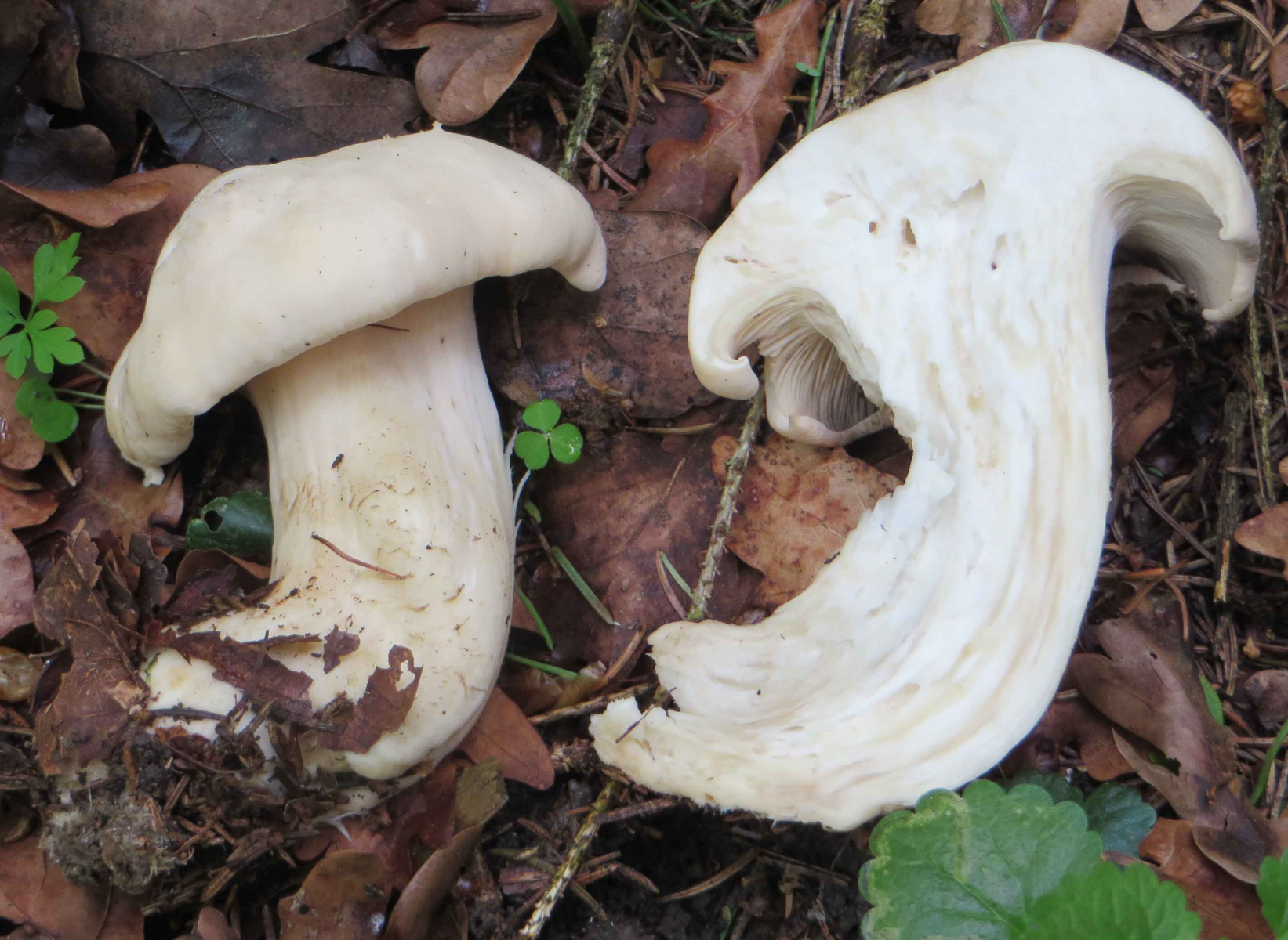 Eingerollte Hutränder, teils sehr dicke Stiele (4-5 cm), sehr dünne Lamellen im Gegensatz zu sehr dickem Hutfleisch, Lamellen dicht stehend, Geruch und Geschmack nach Salatgurken (zum Vergrößern doppelt anklicken):