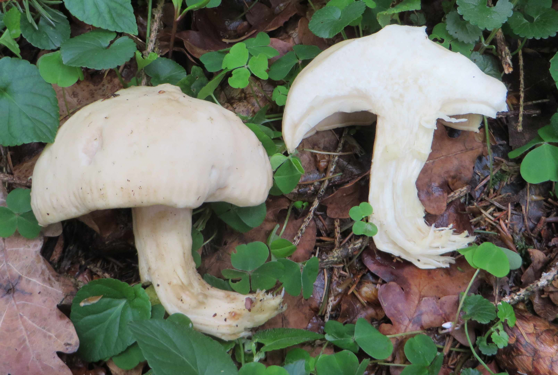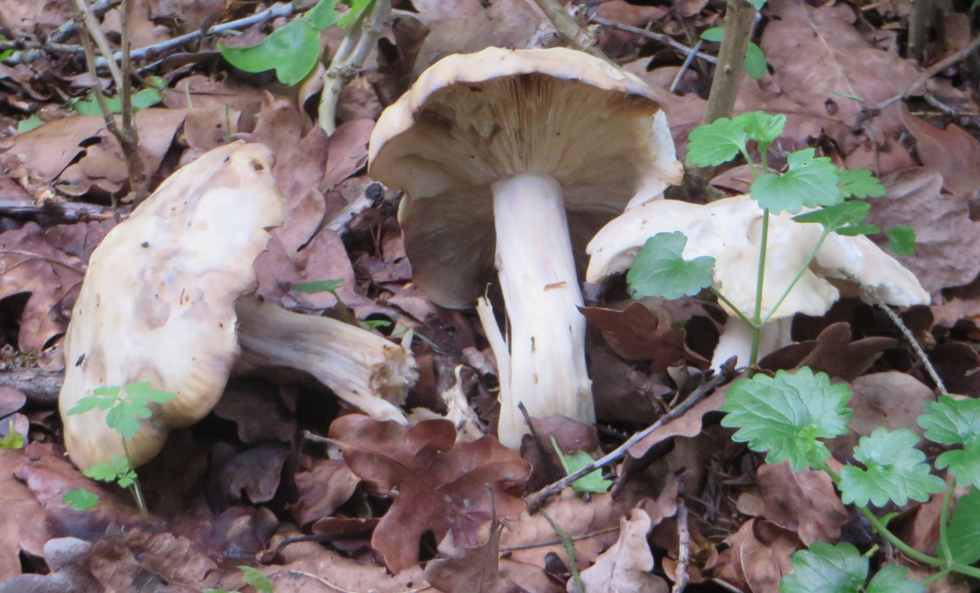 Auf einer begrasten Fläche unter Fichten fand ich gestern zwei Linien von je einem Dutzend weißer Pilze. Die erste Gruppe bestand meiner Einschätzung nach eindeutig aus Maipilzen (Calocybe gambosa):