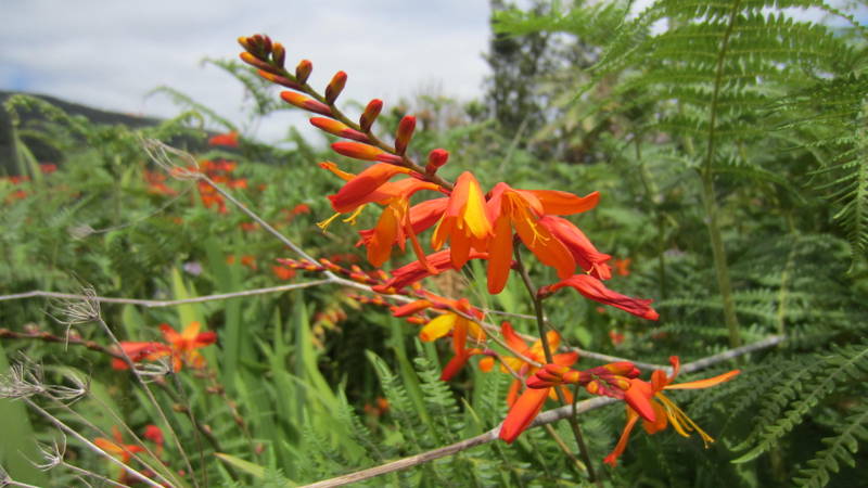 77/ 78 halte ich für Crocosmia × crocosmiifolia, die Montbretie (Gartenhybride). Die habe ich erst im letzten Jahr in einem Garten gesehen und bewundert. Auf den Kanaren ist das schon wieder ein invasiver Neophyt.