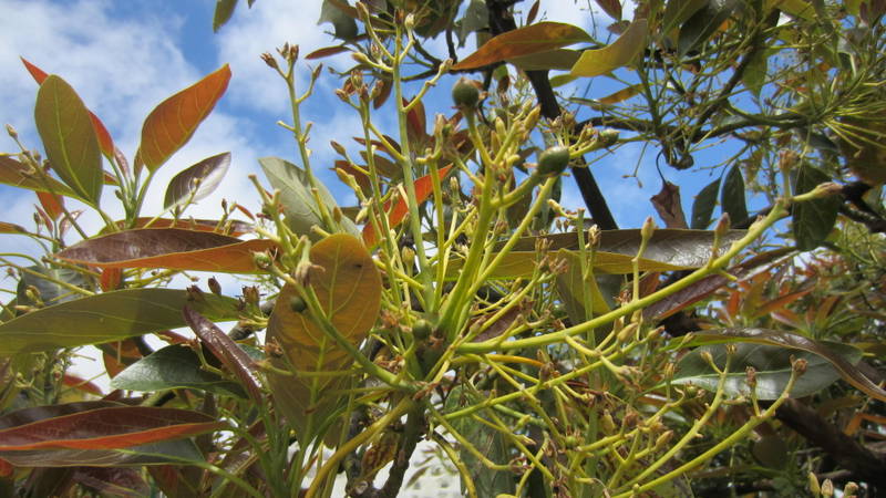 Der Baum blüht im Frühjahr im blattlosen Zustand, später im Jahr kann es nochmal eine geringere Nachblüte geben. Vielleicht kannst du am Originalbild die Blüten besser erkennen?