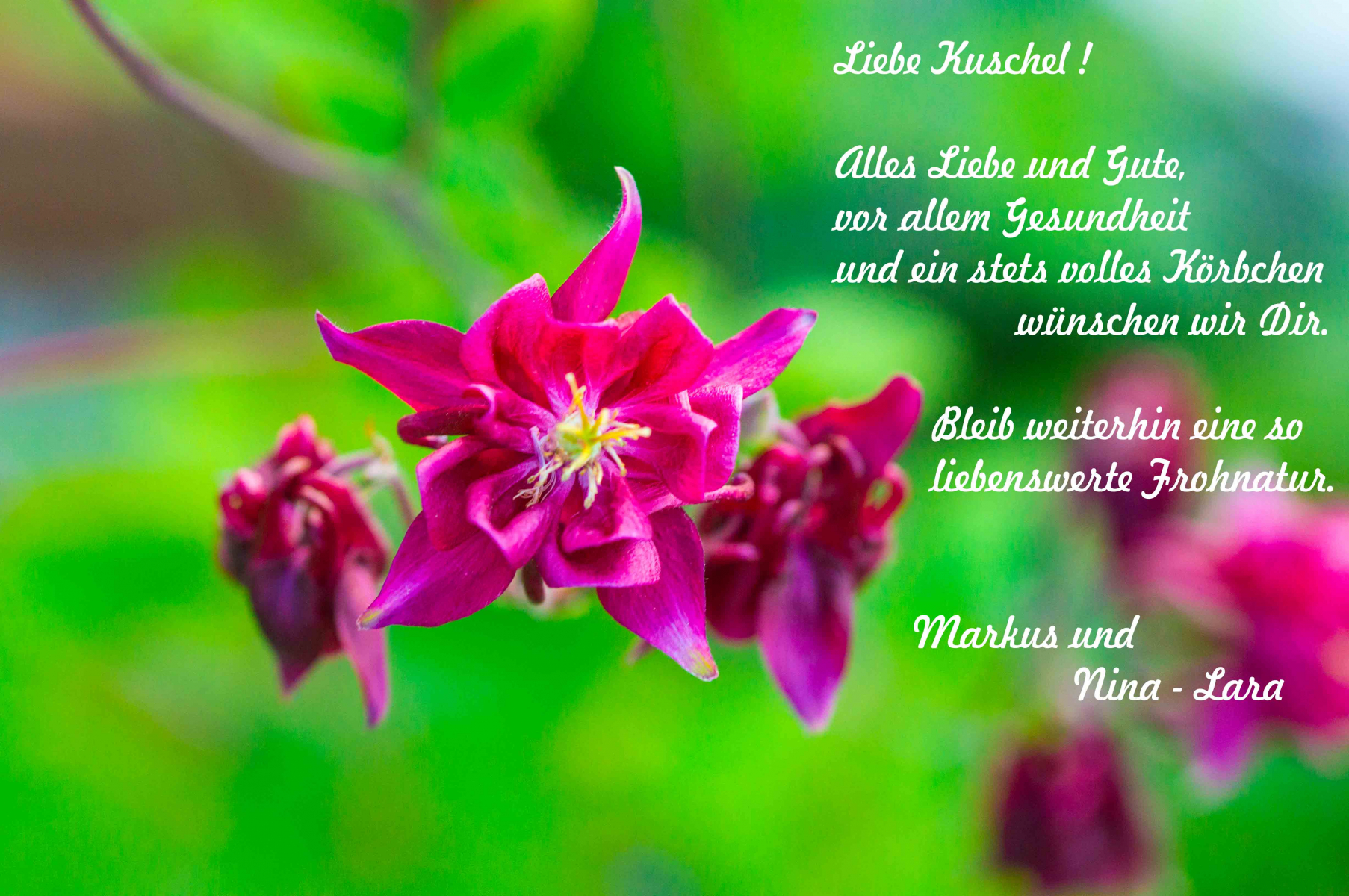 Wir drei wünschen dir Gesundheit und Zufriedenheit,