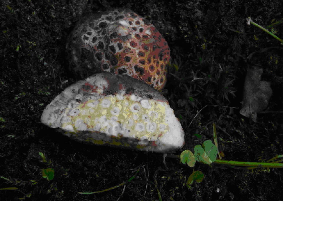 Viele kleine Löcher mit Raupen drin. Das Innere fühlt sich gummiartig an (wie eine alte Sellerieknolle) und ist nahezu geruchlos.... Also scheint es kein Kartoffelbovist zu sein wie einige gemeint haben. Vielleicht eher eine Art Baumschwamm ?