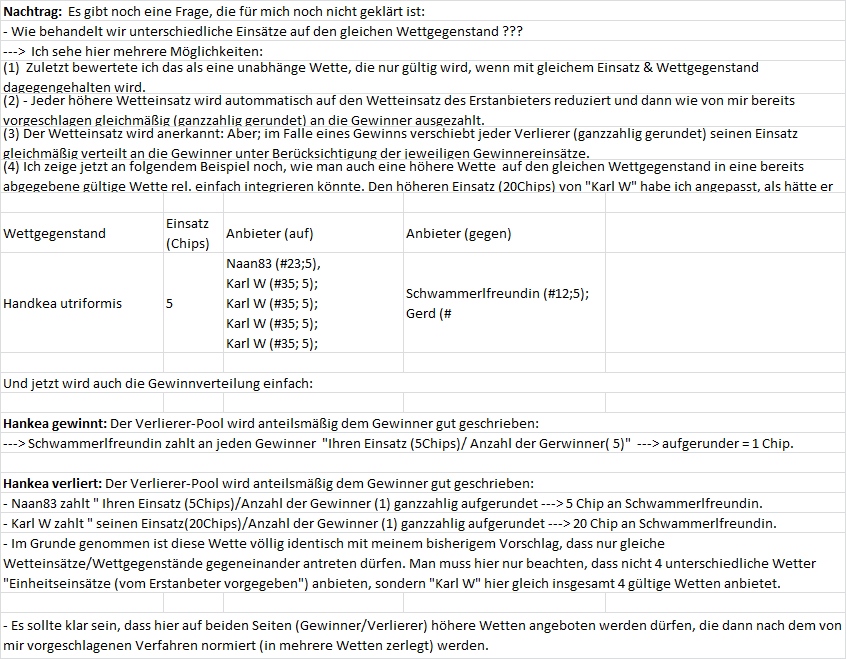 Das sind aber nur meine Gedanken, ich füge mich jeder anderen Regelung, die hier beschlossen wird und stehe natürlich zu meinem Wettangebot.