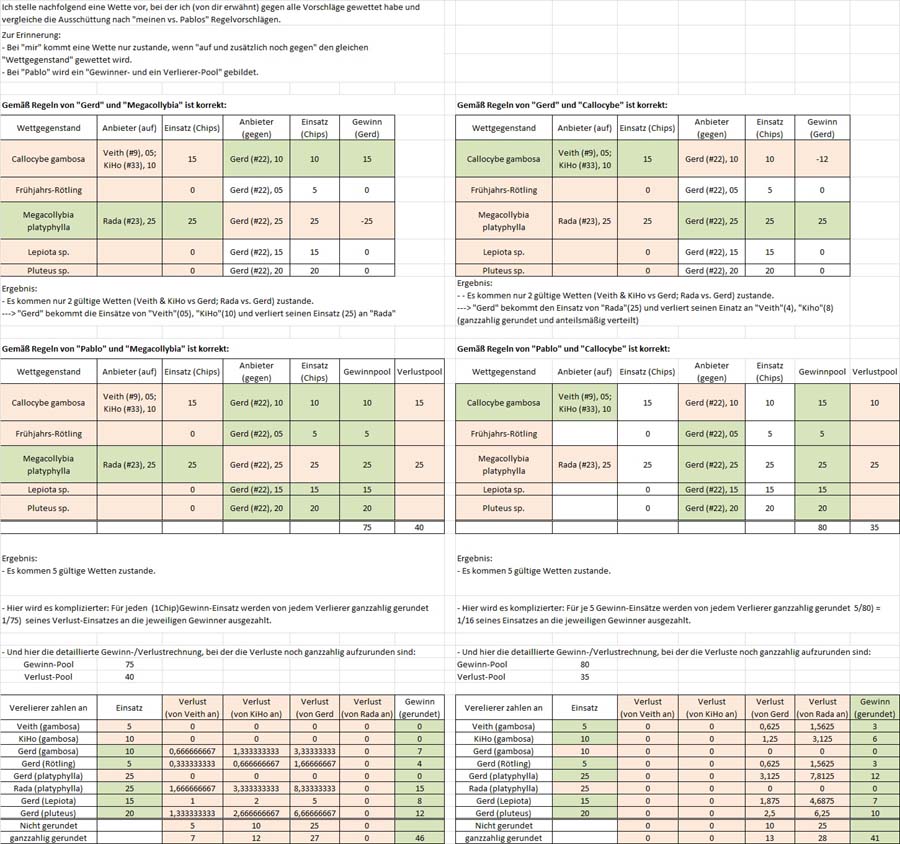 - Anmerkung: Eine gültige Minimalwette (*) mit zwei Spielern wäre z.B. der Erste setzt auf "Boletus edulis (Wettgegenstand)", der Zweite gegen Boletus edulis" (oder umgekehrt).