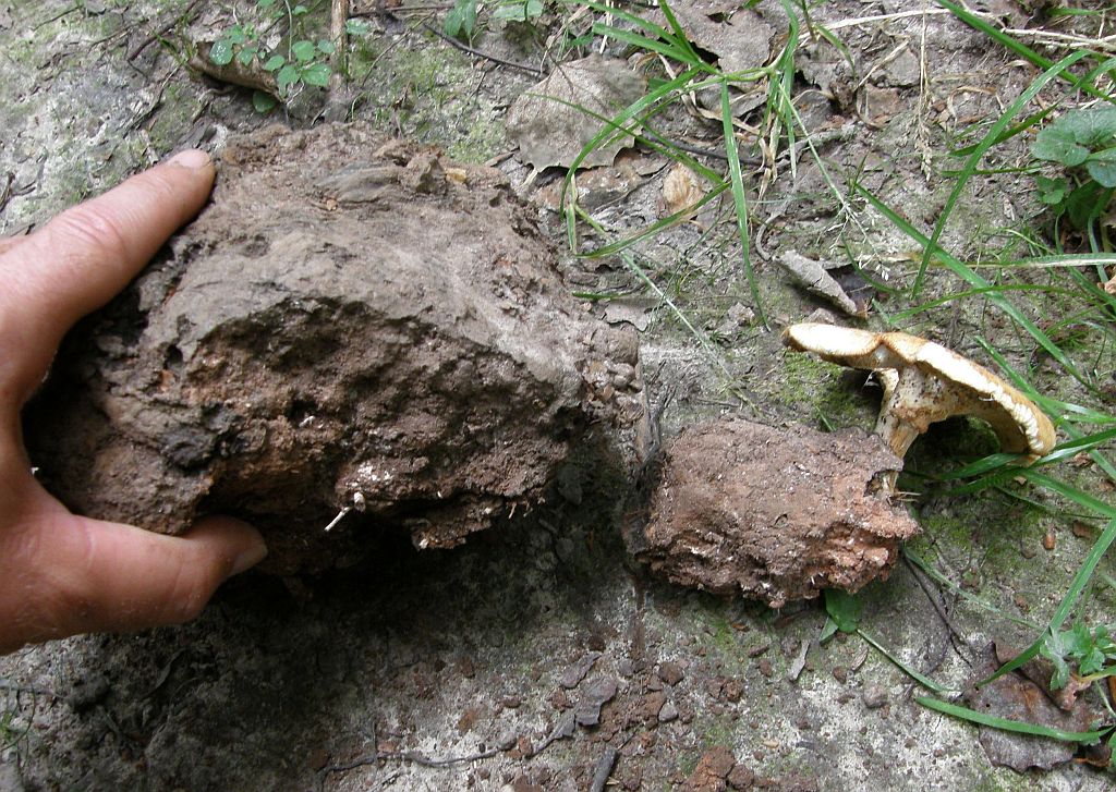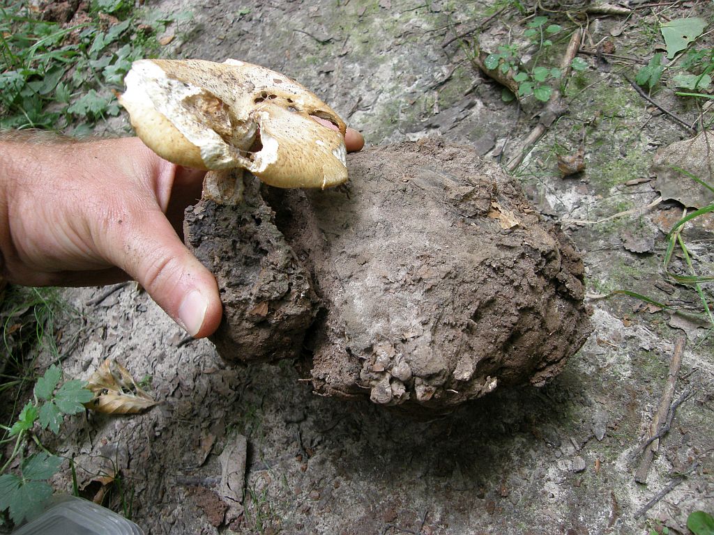 Diese Sklerotien sind anscheinend auch nicht leicht zu finden. Es könnte auch sein, daß der Pilz nicht immer welche ausbildet. Meistens findet man die Fruchtkörper ja direkt an Holz, da habe ich schon öfters nach Mycelsträngen gesucht, die vom Substrat in den Erdboden und dort zu einem Sklerotium führen. Bisher aber ohne Erfolg. Das hier war eiin "auf dem Erdboden" wachsender Fruchtkörper, wo ich mal ein wenig gegraben hatte.